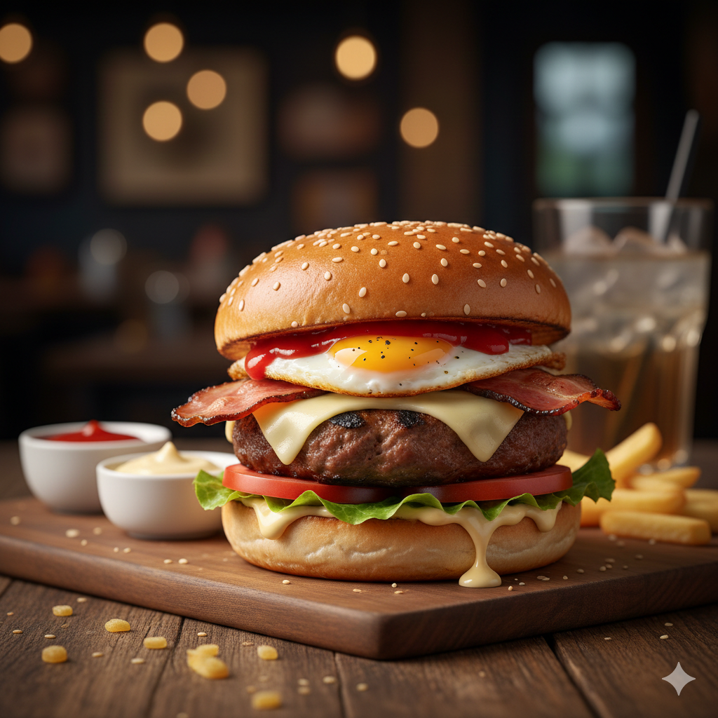 Pan artesanal, huevo, tocineta, torta de carne 150 g, queso americano, tomate, lechuga, salsa de tomate y mayonesa artesanal.