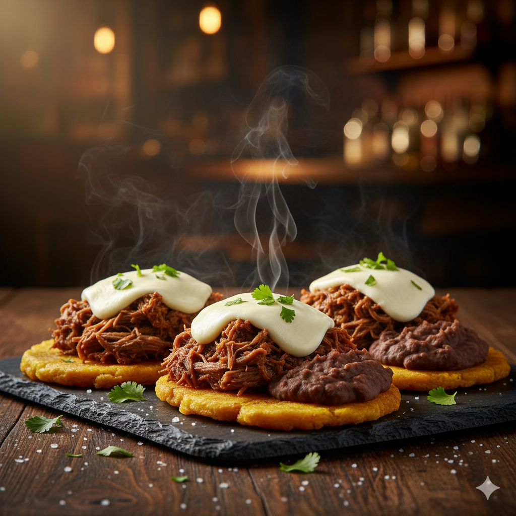 Patacones de plátano con carne mechada, frijoles y queso mozzarella.