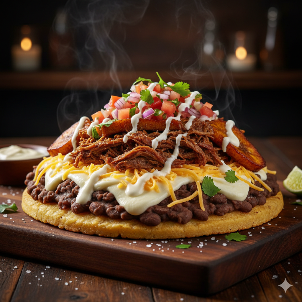 Plátano rayado, carne mechada, queso mozzarella, queso cheddar, pico de gallo, natilla, salsa de tomate y mayonesa artesanal.