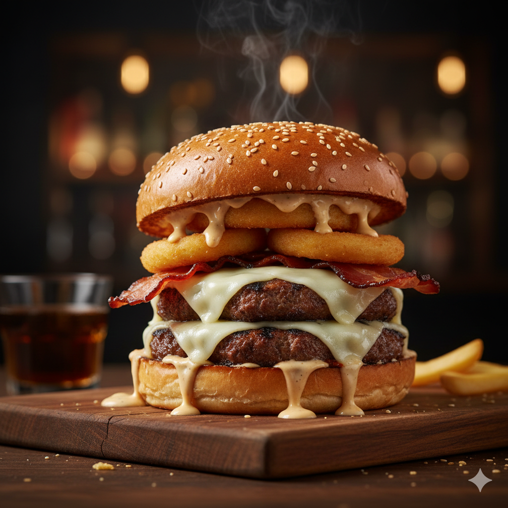 Pan artesanal, tocineta, aros de cebolla, doble queso, doble torta, salsa de la casa.