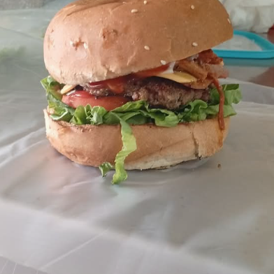 Hamburguesa con torta de carne, lechuga, tomate, jamón, queso, carne desmechada y nuestras deliciosas salsas de la casa.