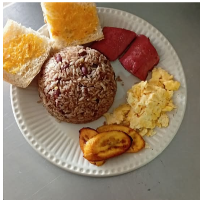 Gallo pinto, pan, plátano, huevo, salchichón.