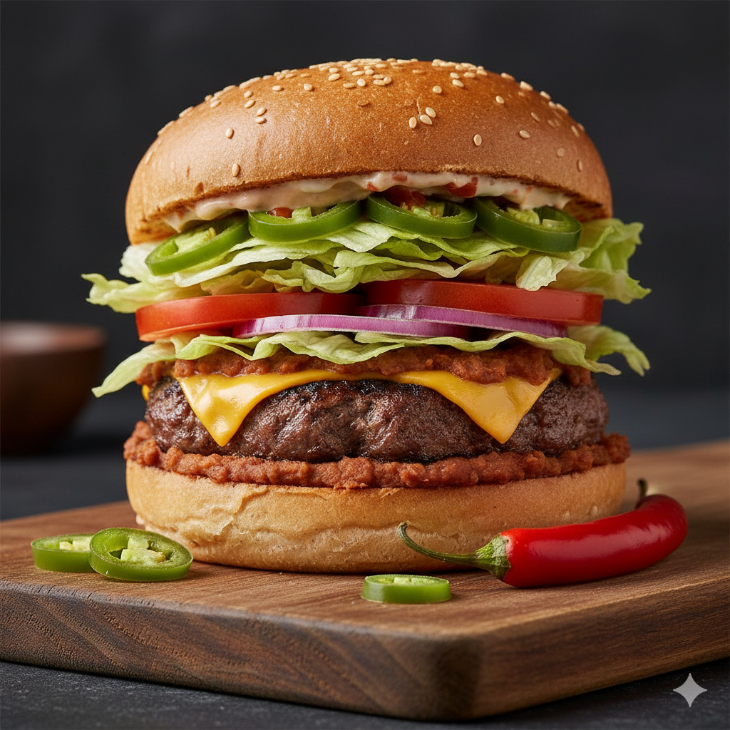 Hamburguesa con torta de carne, lechuga, tomate, salsa búfalo, jamón queso y nuestras deliciosas salsas de la casa.
