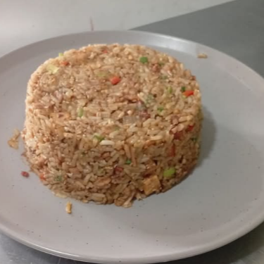 Porción de arroz de 450 g Con jamón, carne, pollo, cebolla, salsa de la casa y camarones. 🦐