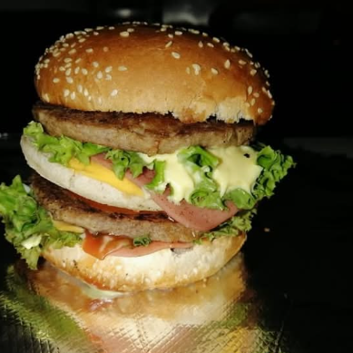 Hamburguesa con doble torta de carne, doble lechuga, tomate, jamón, queso y nuestras deliciosas salsas de la casa.