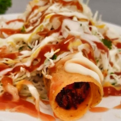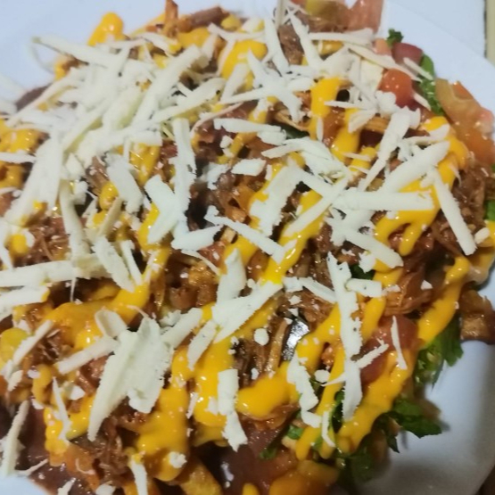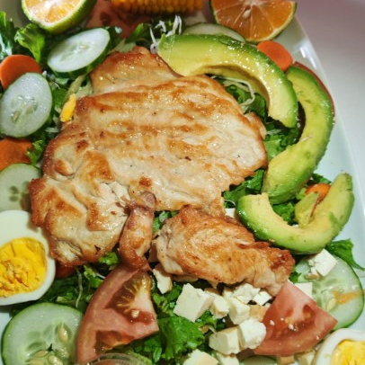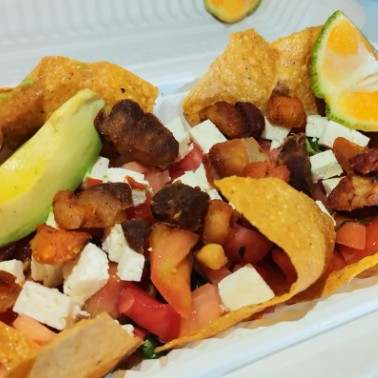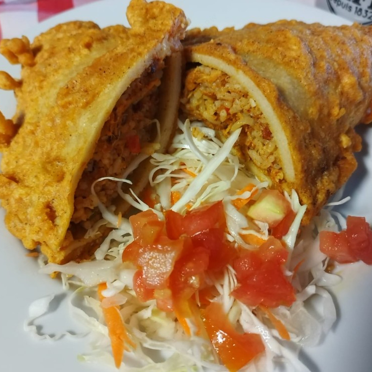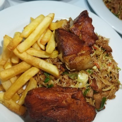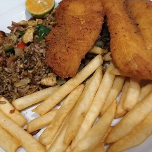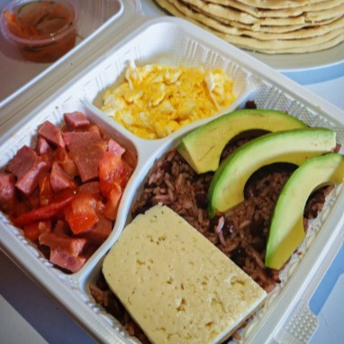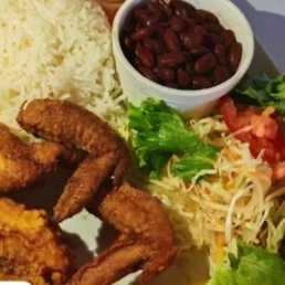 Arroz, frijoles, ensalada,platanitos tostados,alitas.