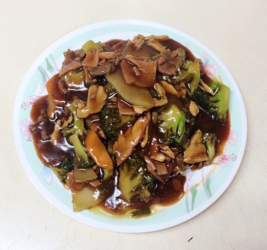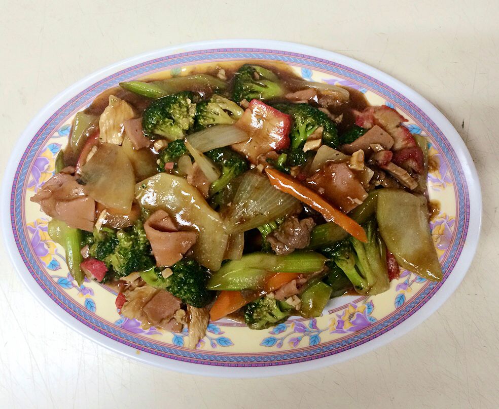 Con jamón, lechón, pollo, carne de res, brócoli, chayote, mostaza china, zanahoria.