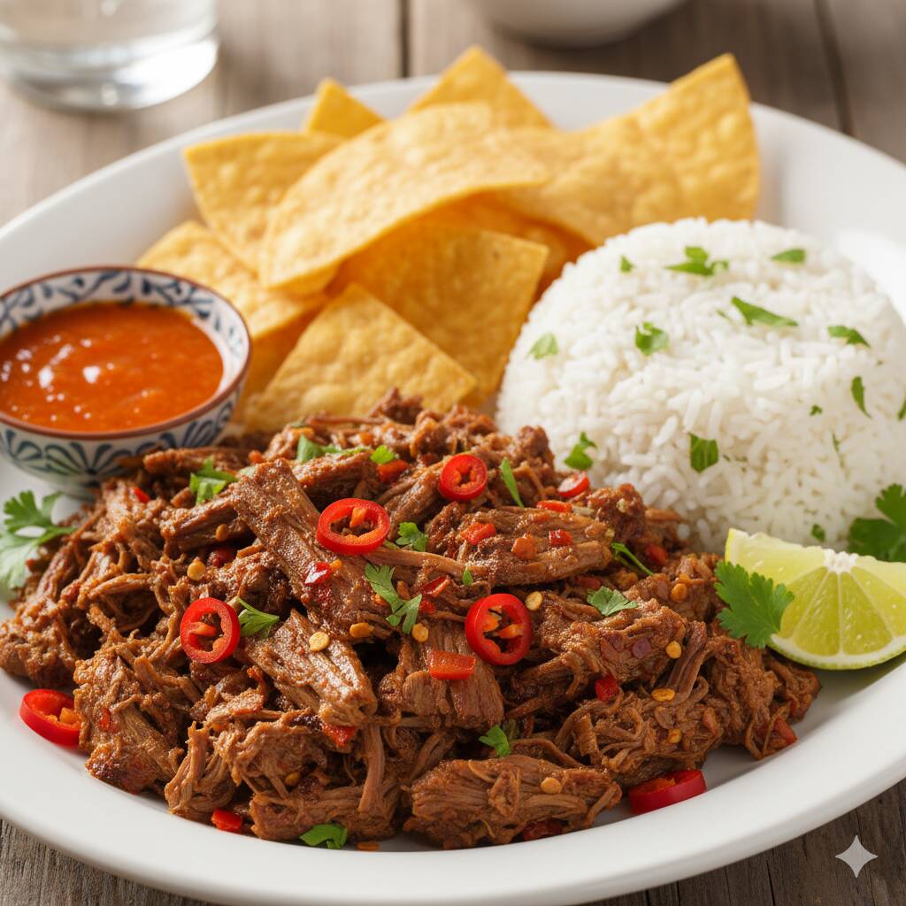 Carne de res mechada, con picantico, acompañada de arroz, y tortillitas fritas.