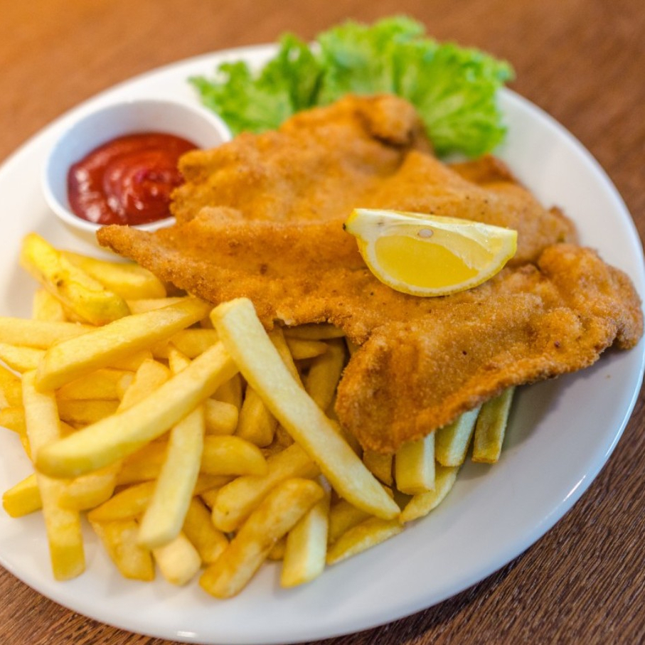 Filet de pescado empanizado acompañado de papas fritas y ensalada de lechuga y tomate.