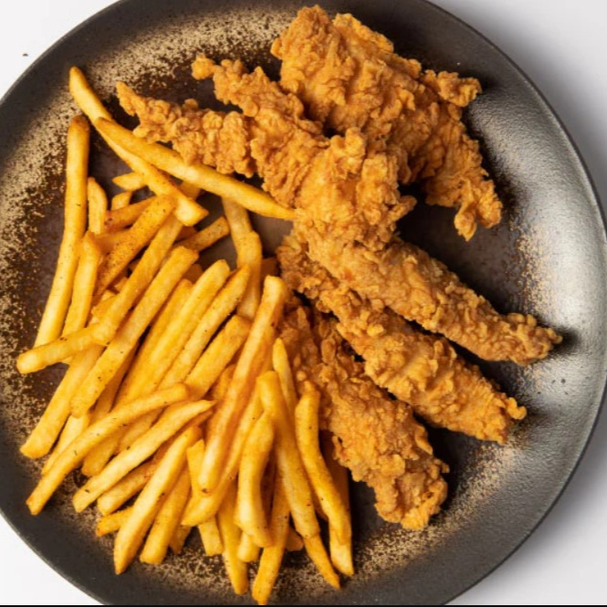 Deliciosos dedos de pescado empanizados servido con papas fritas y ensalada de lechuga y tomate.