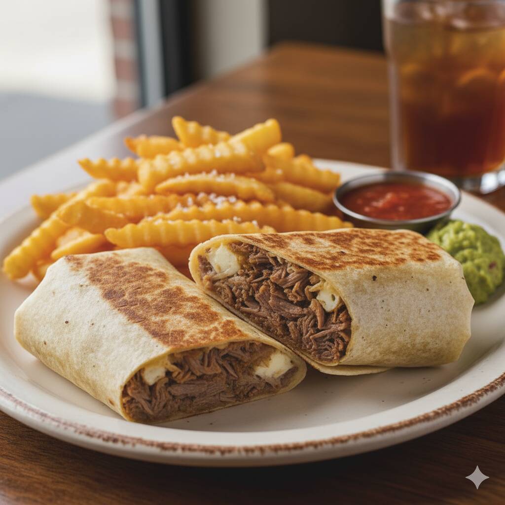 Tradicional burrito de tortilla de harina, con tu carne favorita y acompañado de papas fritas.