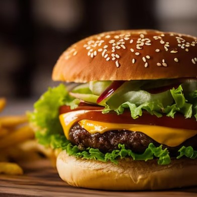 Hamburguesa tradicional con torta de carne de res, lechuga, tomate, queso.