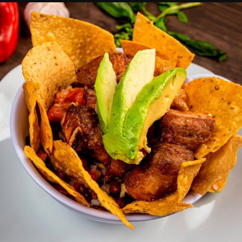 Chifrijo caserito con arroz blanco, frijol tierno, pico de gallo, tortillitas y chicharrón.