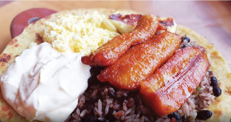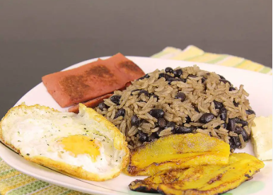Deliciosa porción de pinto con huevo natilla maduro salchichón pan (porción personal)