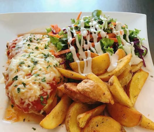 Deliciosa pechuga de pollo acompañada de queso mozzarella, jamón, papas al romero y ensalada.