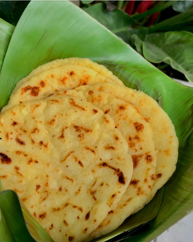 Deliciosa arepa colombiana de maíz cascado rellena de papa y carne.