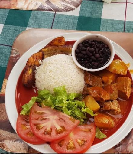 Delicioso casado acompañado de porción de arroz, frijoles, maduro, ensalada + refresco de la casa.