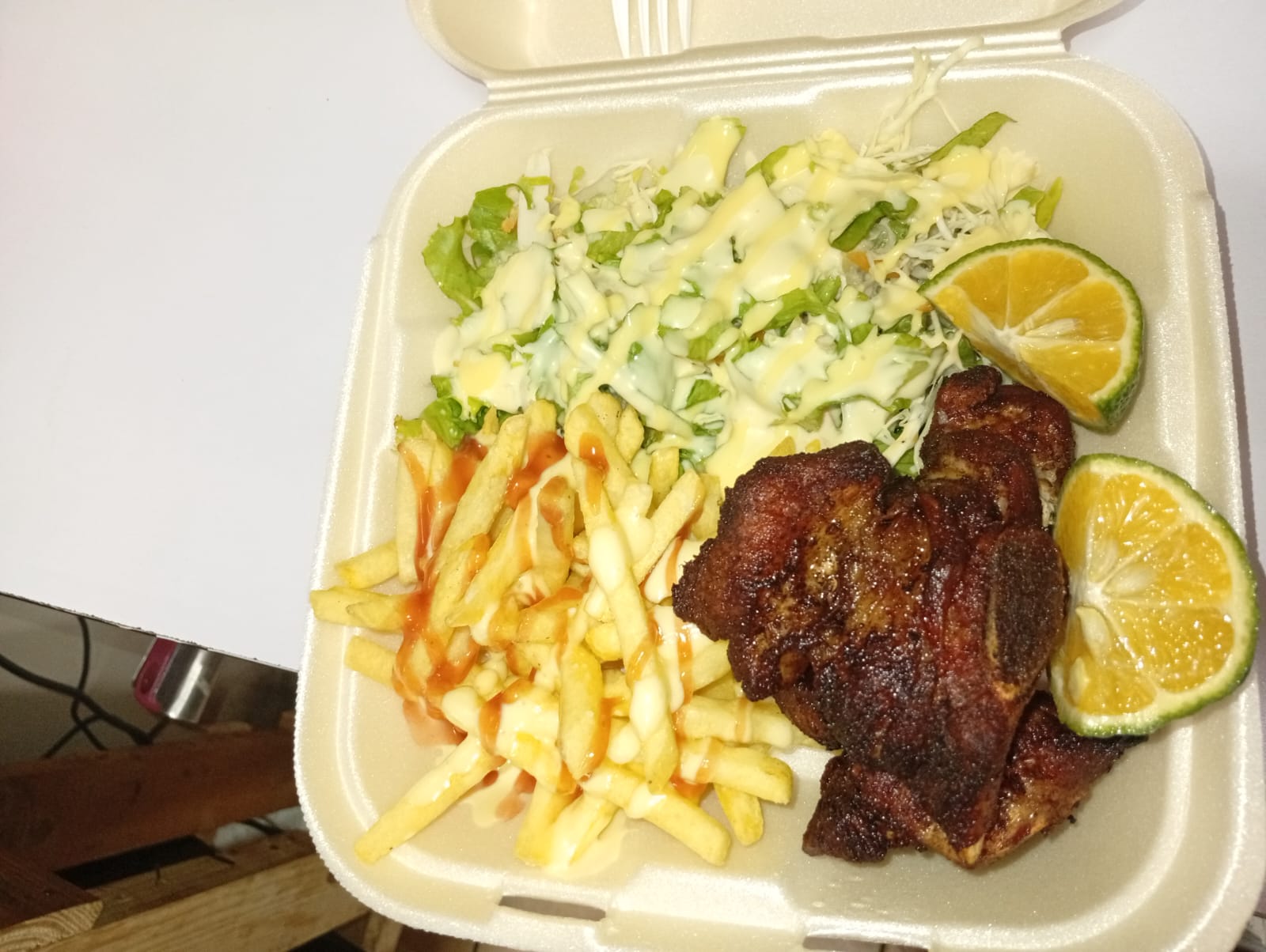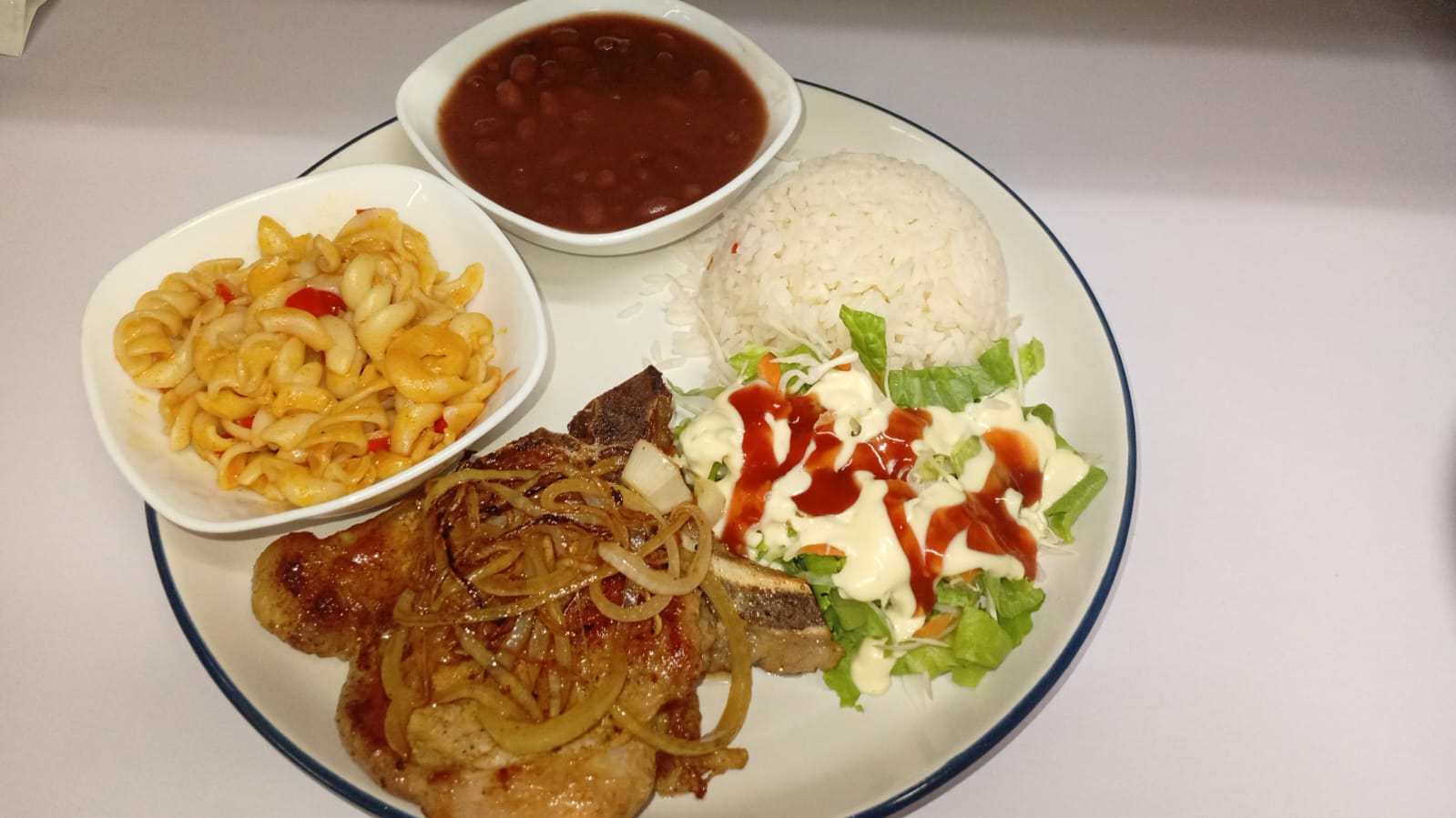 Arroz .frijoles. ensalada espaguetis o plátano maduro proteína hígado .pollo frito. costilla.biste.chuleta