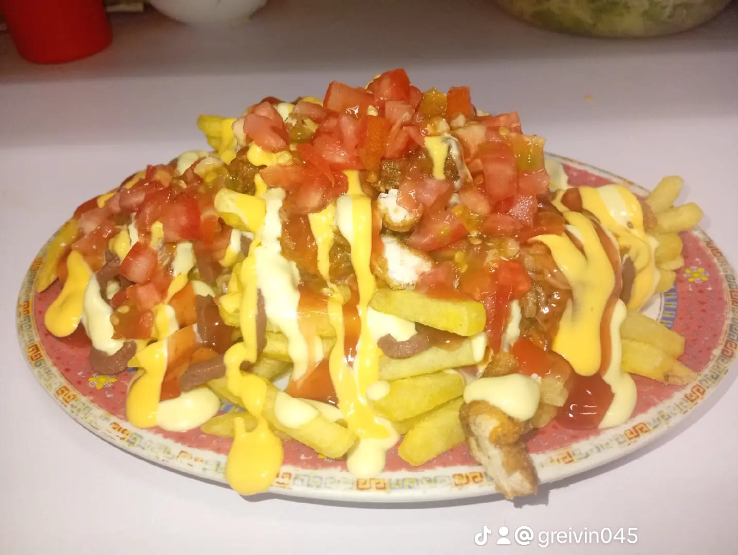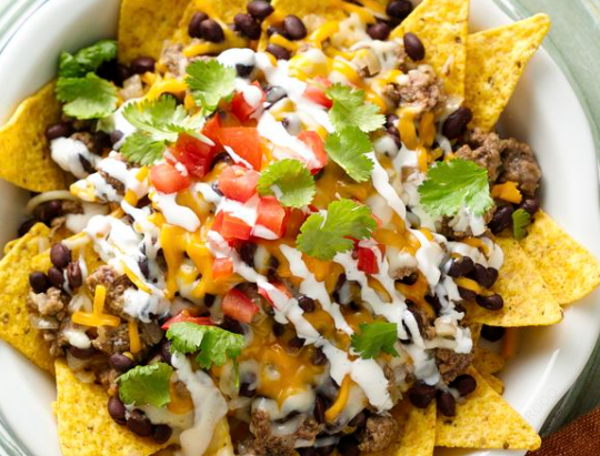 Totopos de maíz, pollo desmenuzado, carne de res sazonada, frijoles molidos, queso fundido, pico de gallo, guacamole y crema.