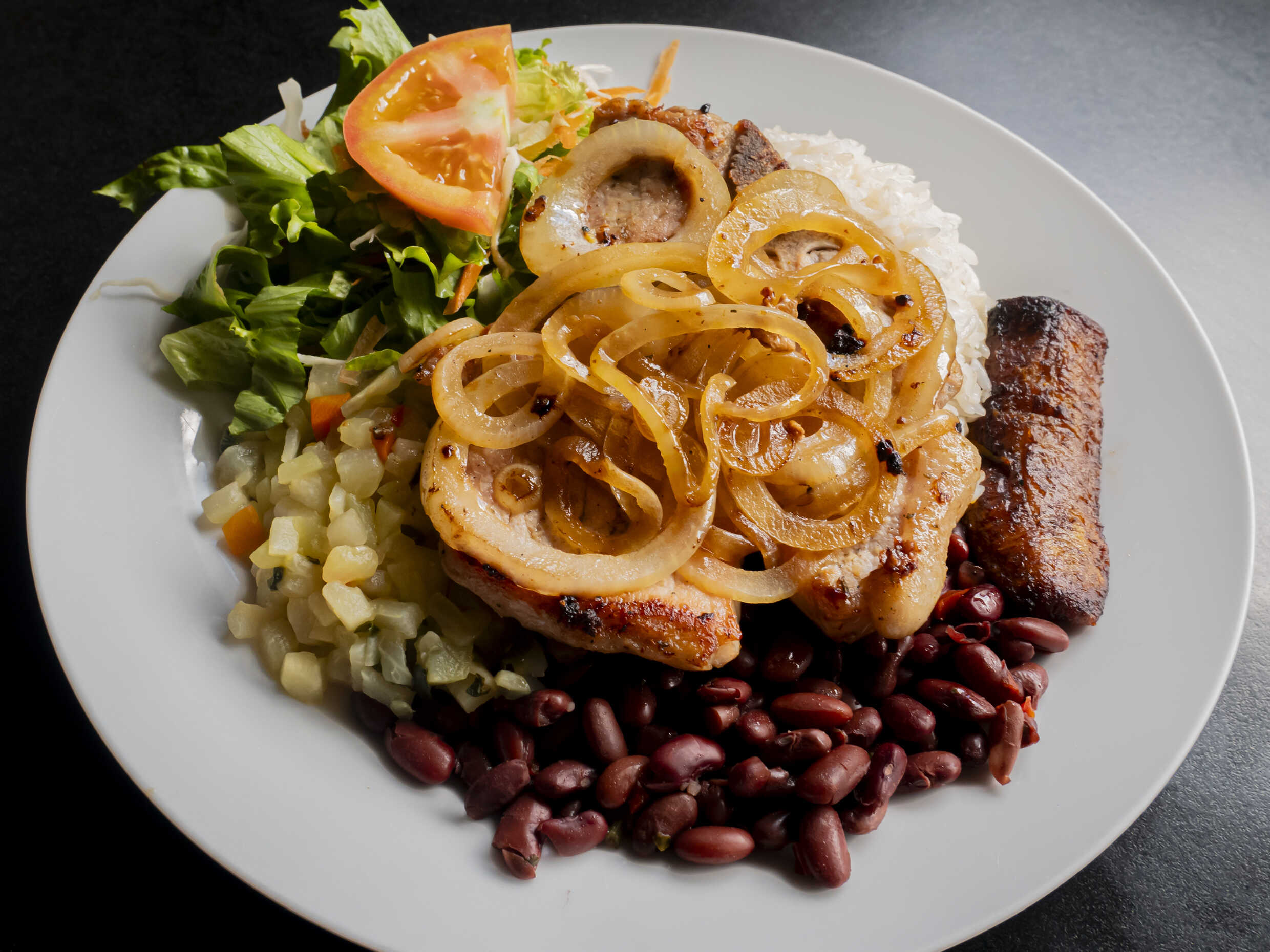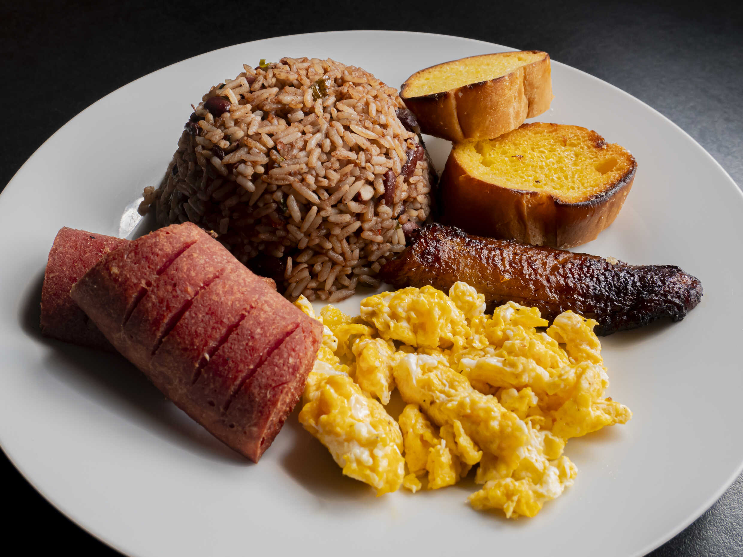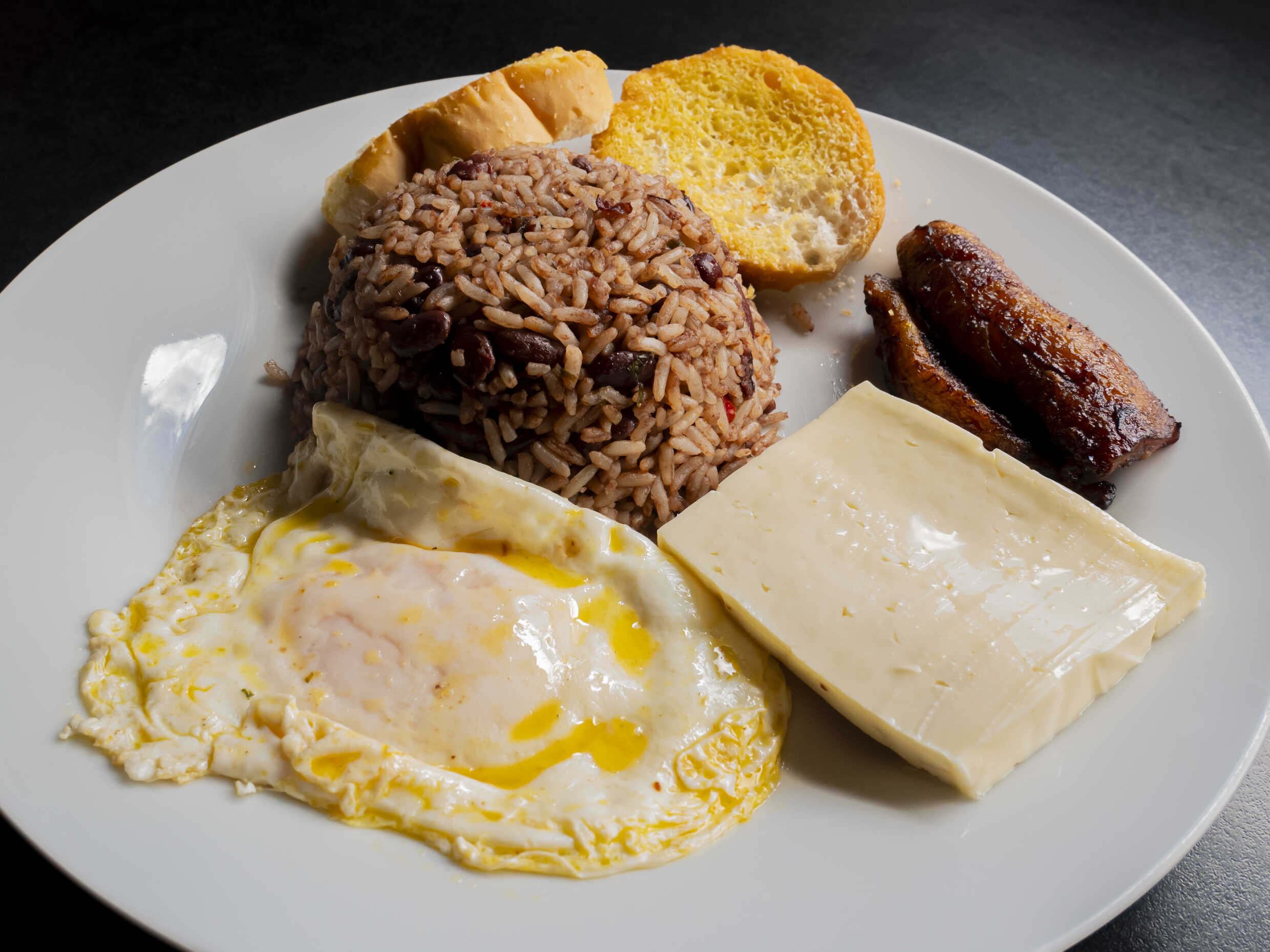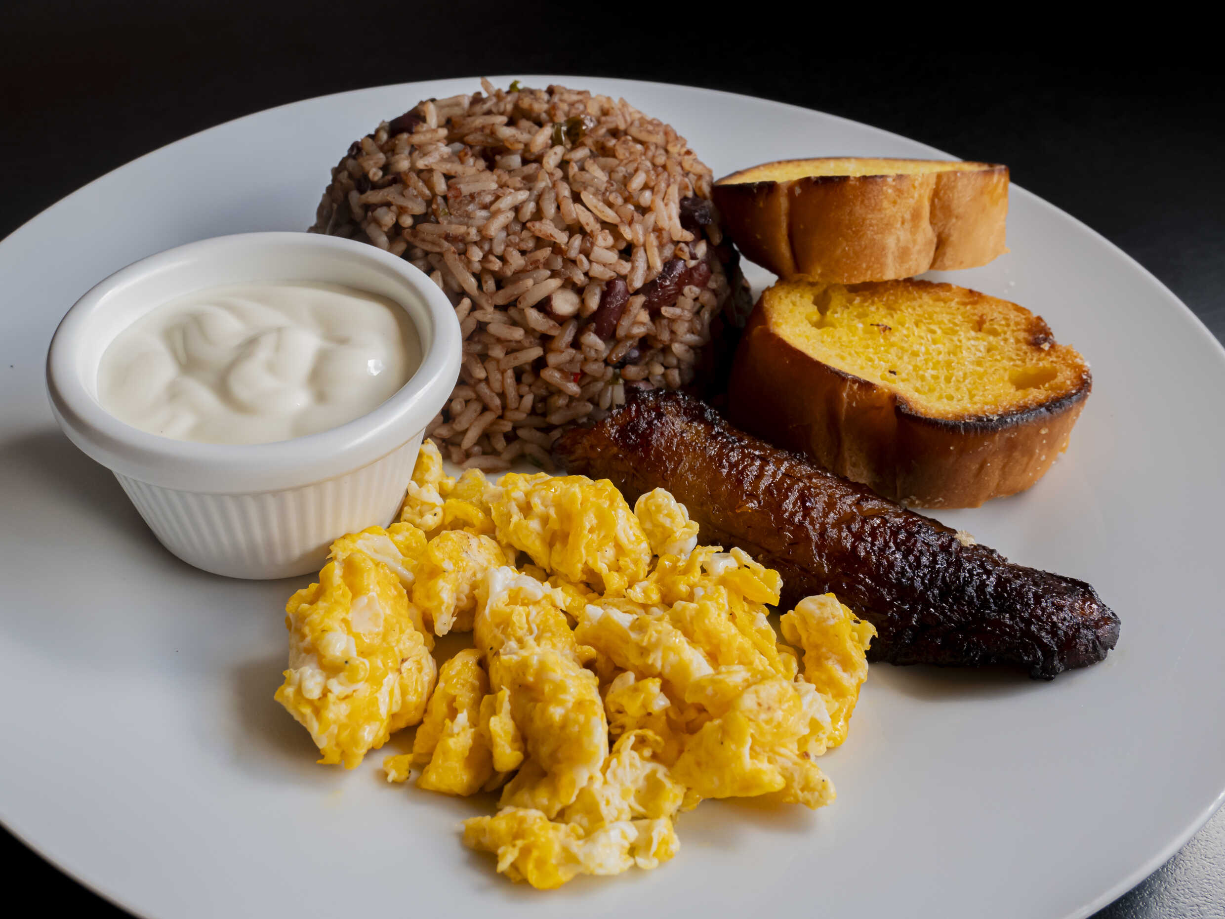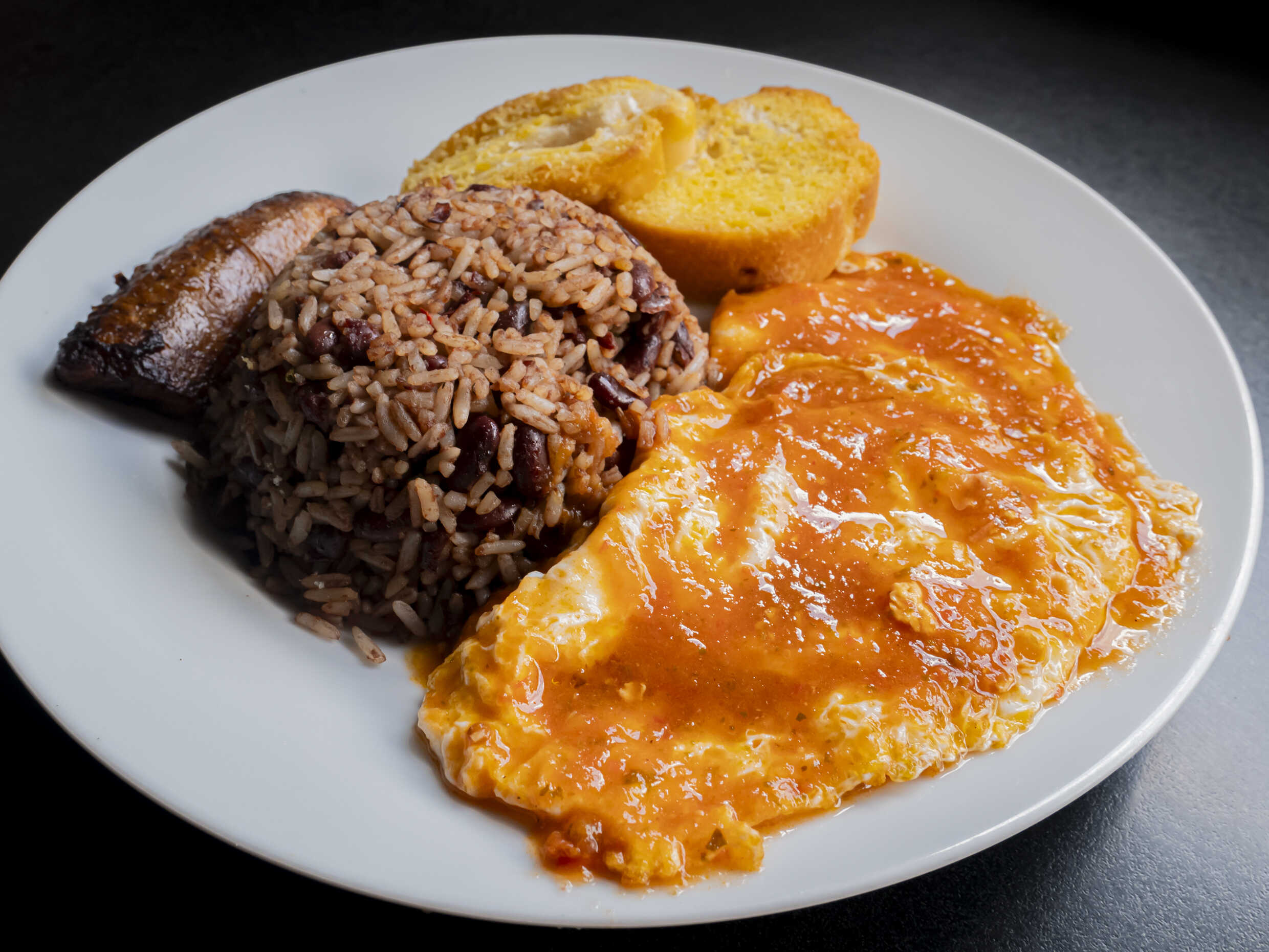 Deliciosa orden de Gallo Pinto acompañado de platano maduro, pan y la proteina de tu eleccion.