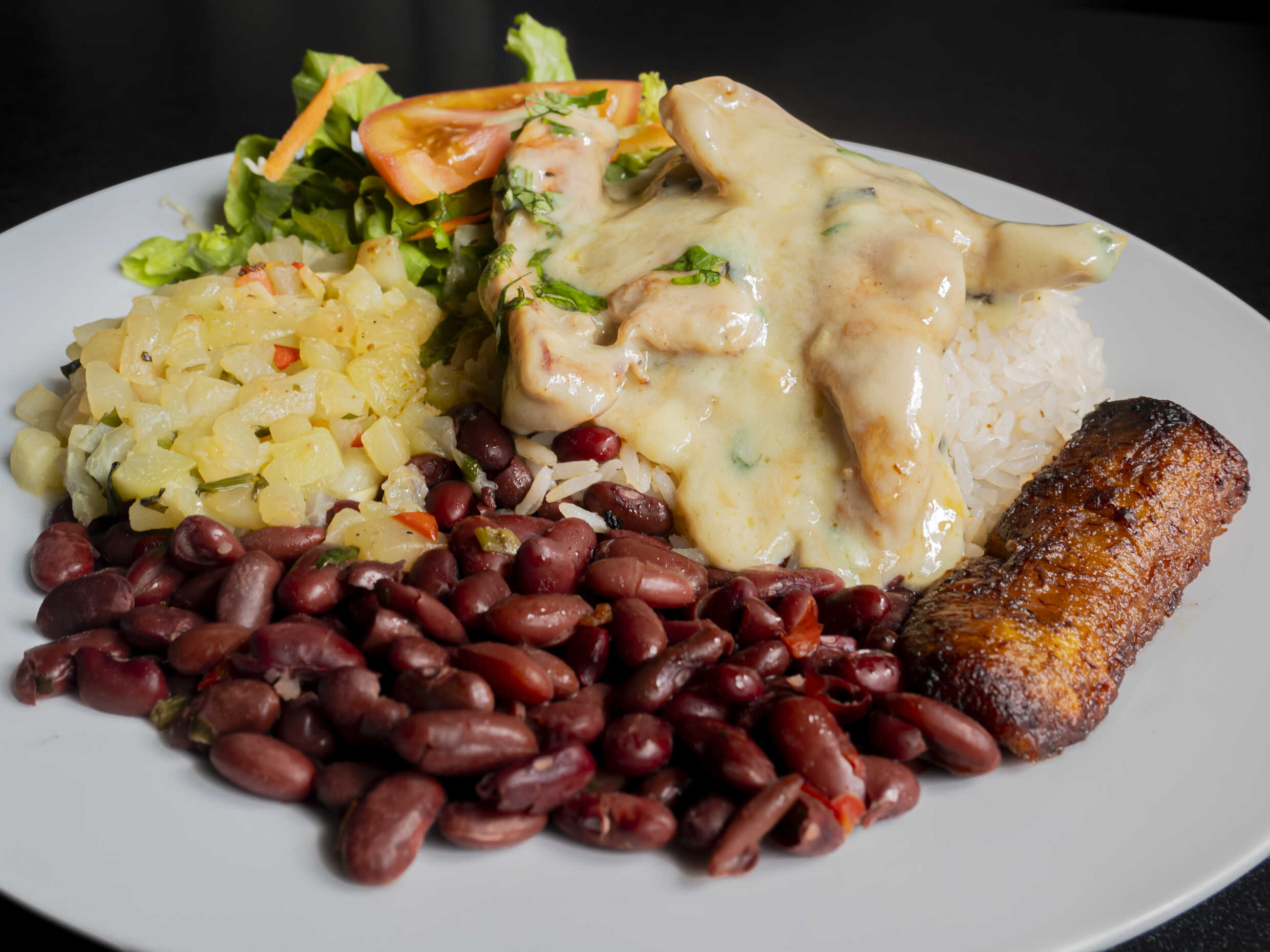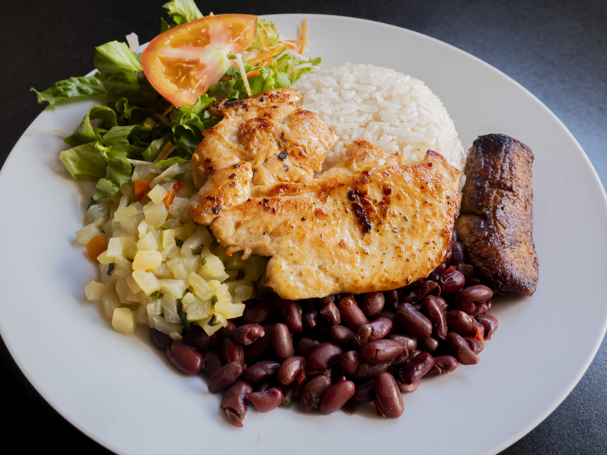 Arroz, frijoles, maduro, acompañamiento del día, ensalada y pollo