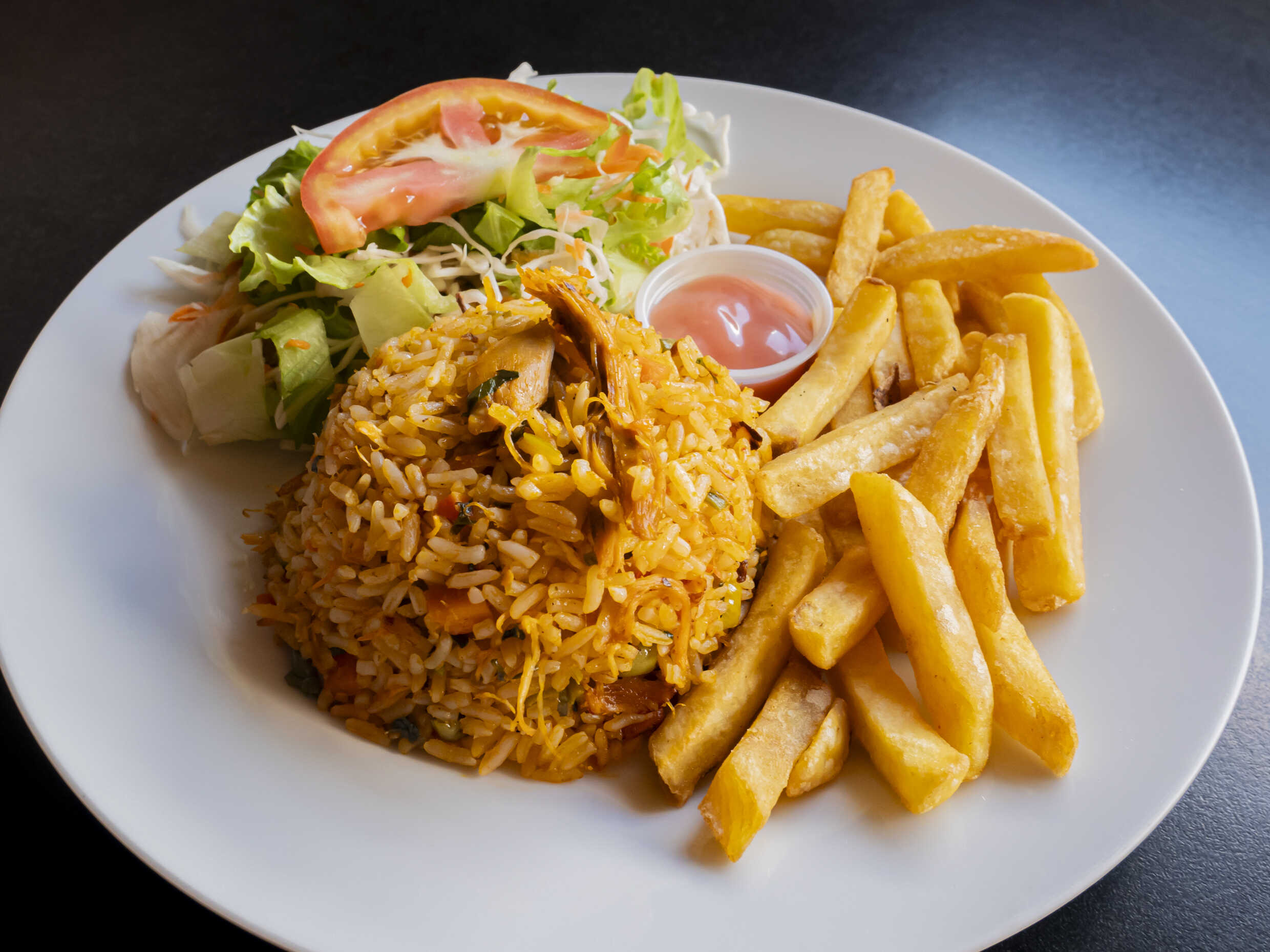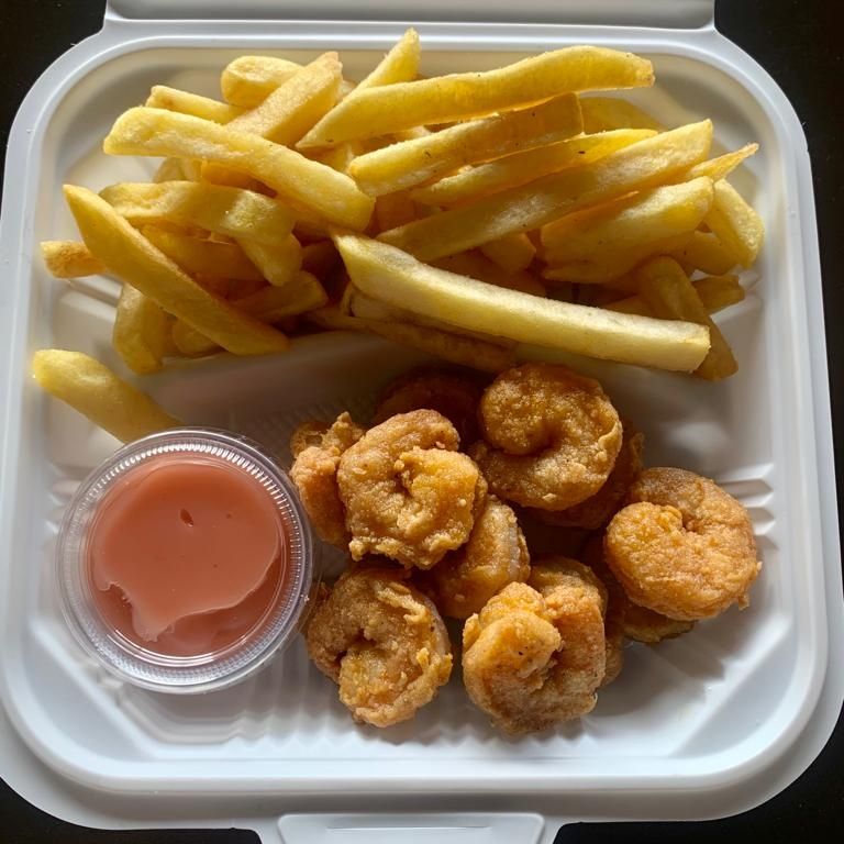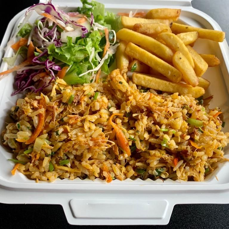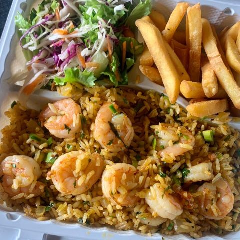 arroz con camarones (12) acompañado de papas fritas y ensalada