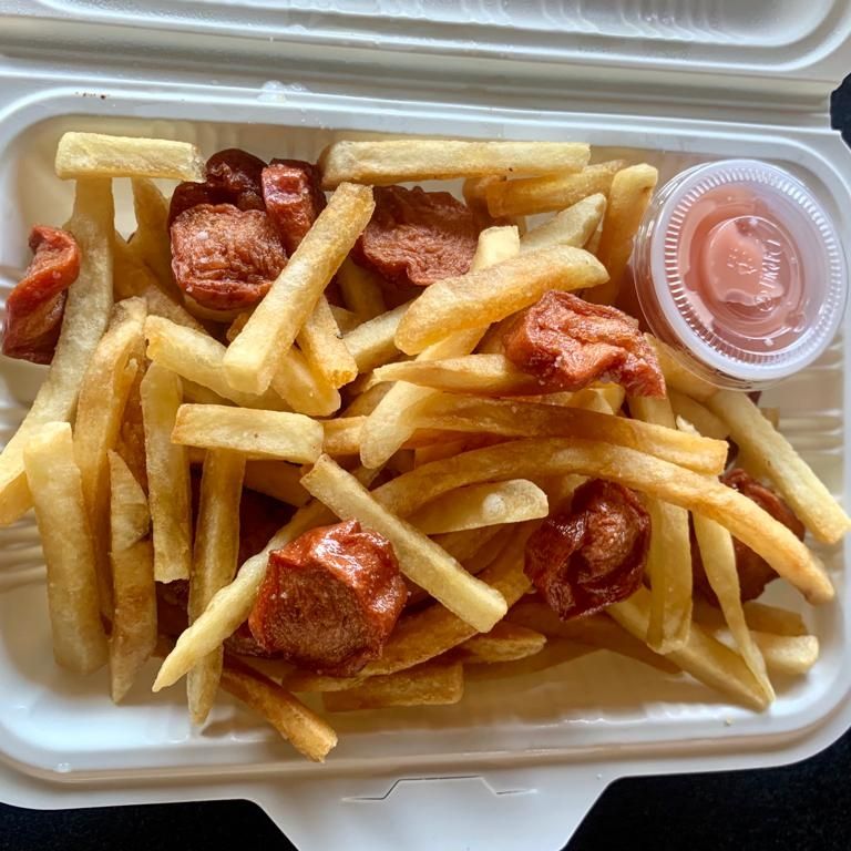 papas fritas con salchichas y salsa de la casa