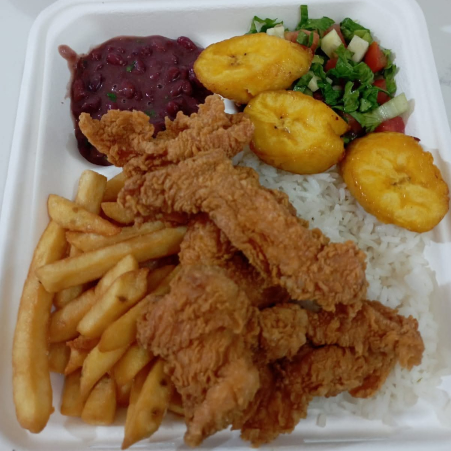 Fajitas Crispy, con Arroz, Frijoles, Plátano Maduro, Ensalada, Papas y Refresco.