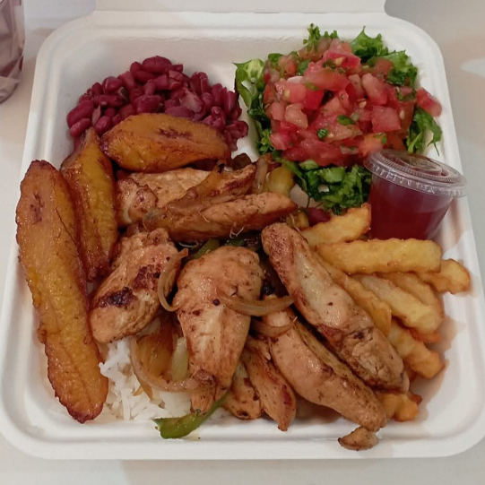 Fajitas a la Plancha, con Arroz, Frijoles, Plátano Maduro, Ensalada, Papas y Refresco.