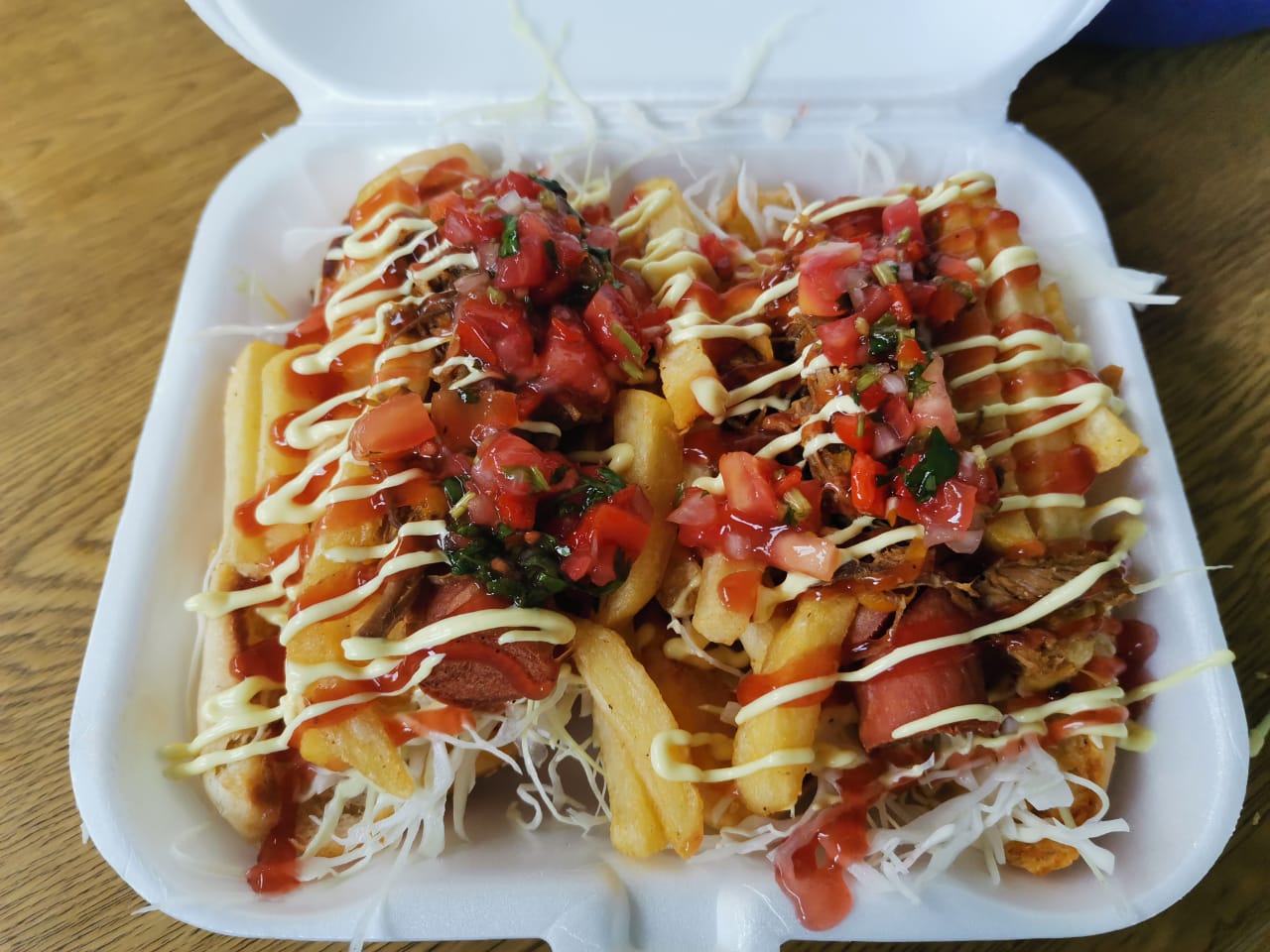 Carne y pollo, jamón y queso, tomate, lechuga, queso fundido y papas.