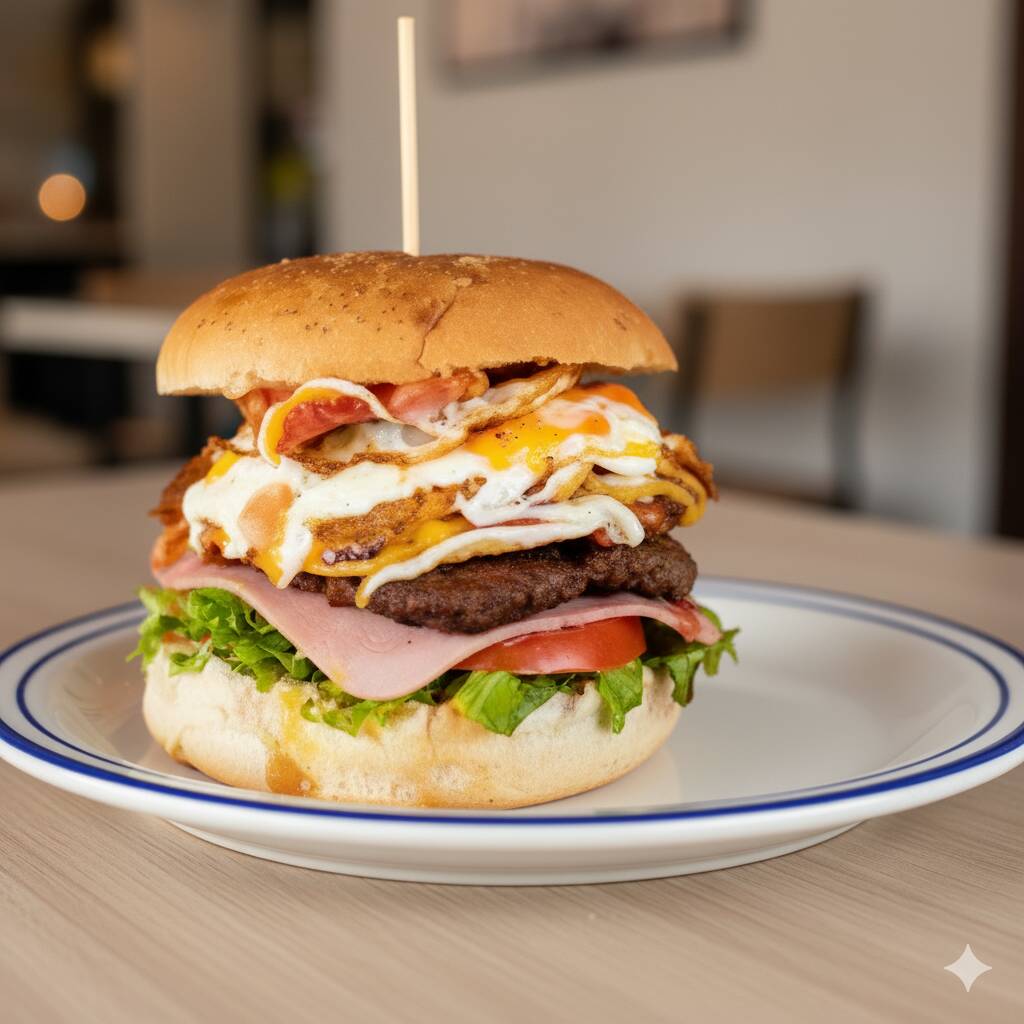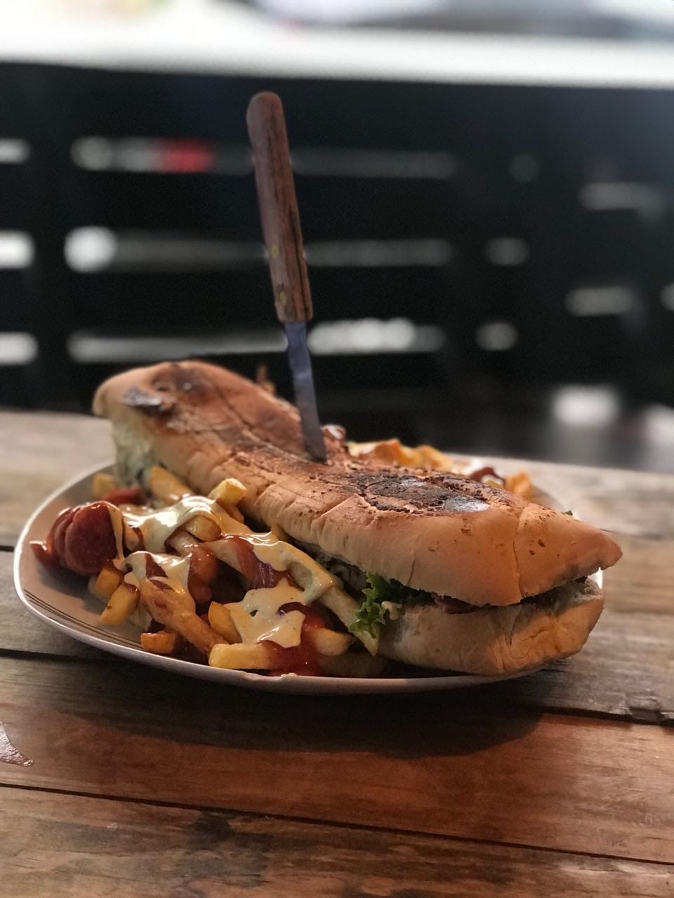 Torta casera con 120 g de carne de res, lechuga, tomate, jamón, queso amarillo y pan artesanal. Acompañada de salsas: mayonesa, salsa de tomate, salsa de queso y papas.