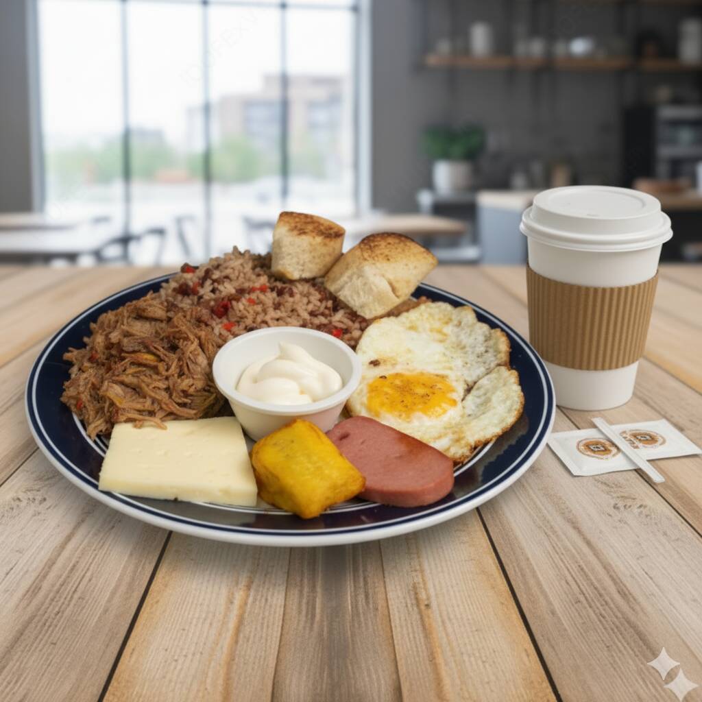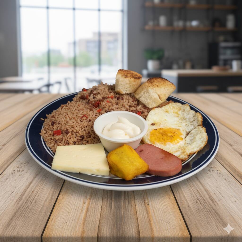 Pinto, salchichón, huevo, natilla, queso, maduro y pan.