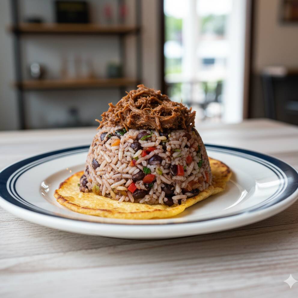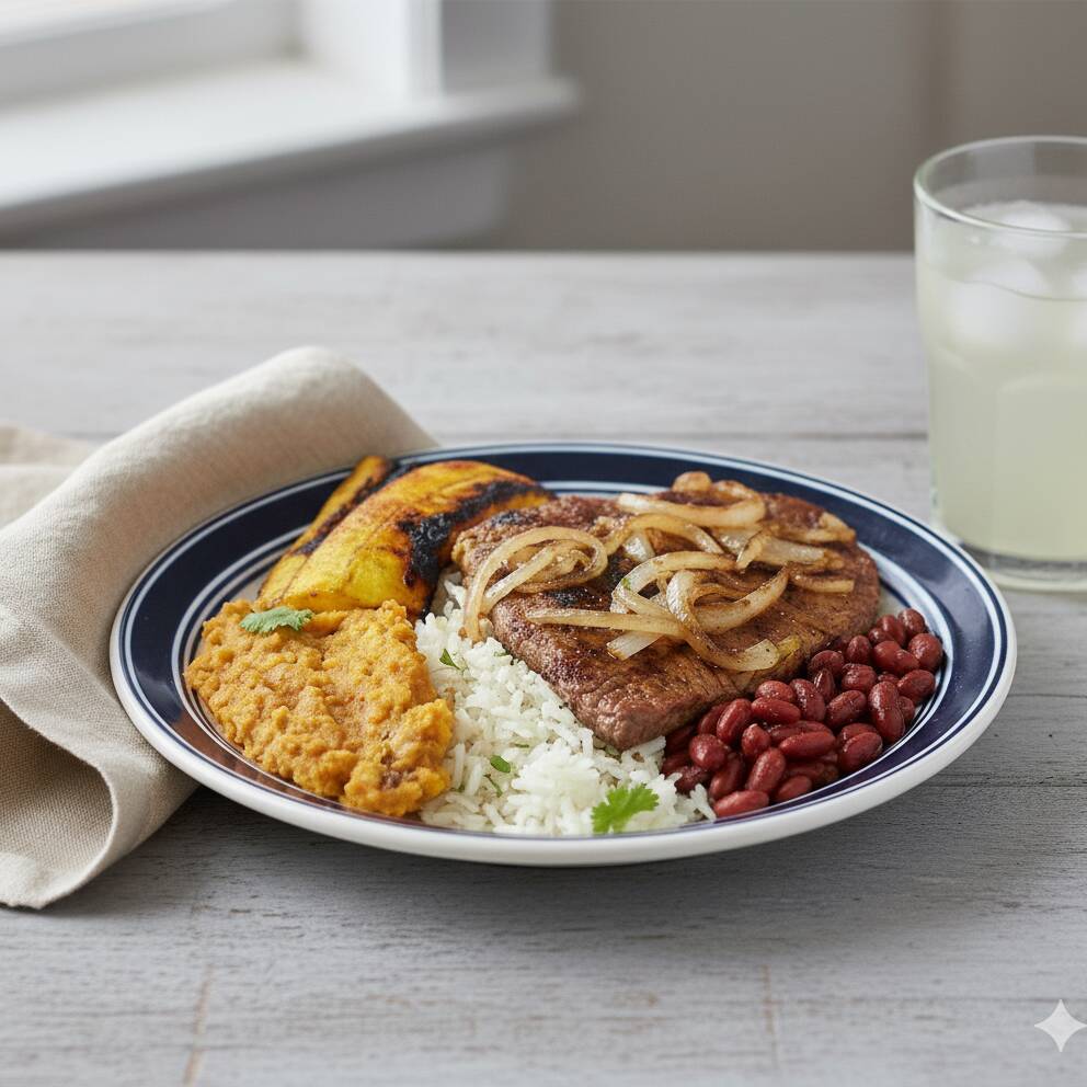 Acompañado de arroz blanco, frijoles, ensalada verde, plátano maduro y tortillas, con proteína a elegir.