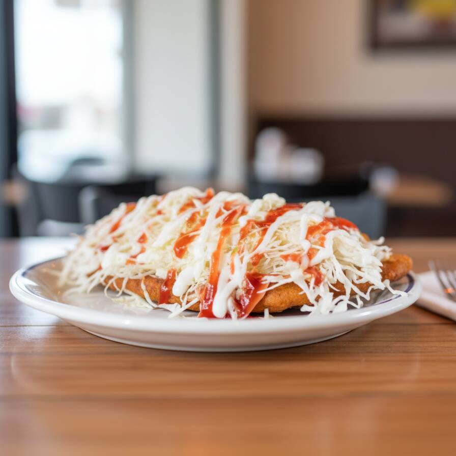 2 Tortas, queso cheddar, cebolla en cuadro, mostaza y salsa de tomate.