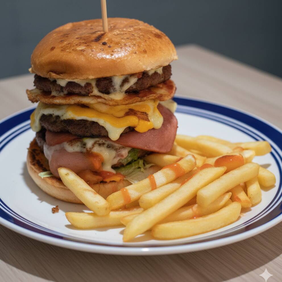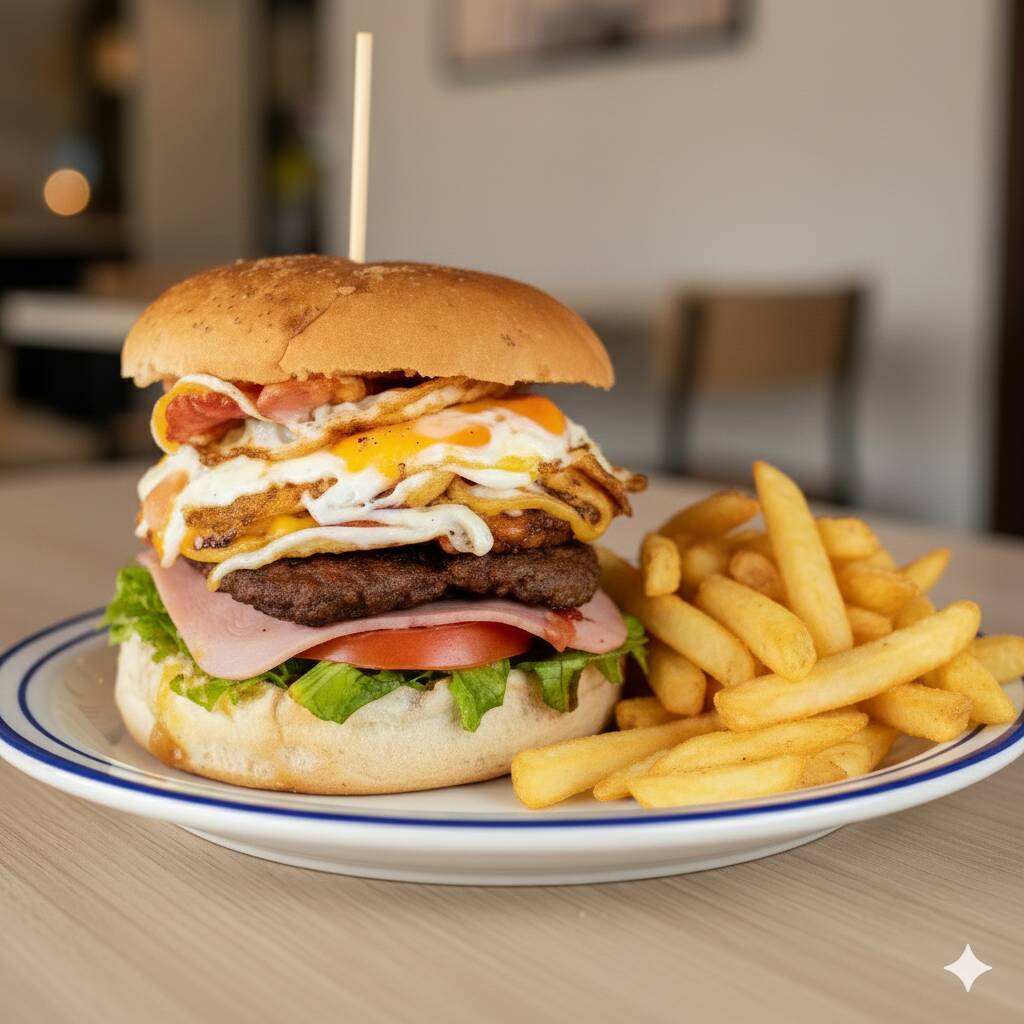 Hamburguesa con deliciosa torta de carne, queso amarillo, jamón, lechuga y tomate, acompañada por papas fritas.