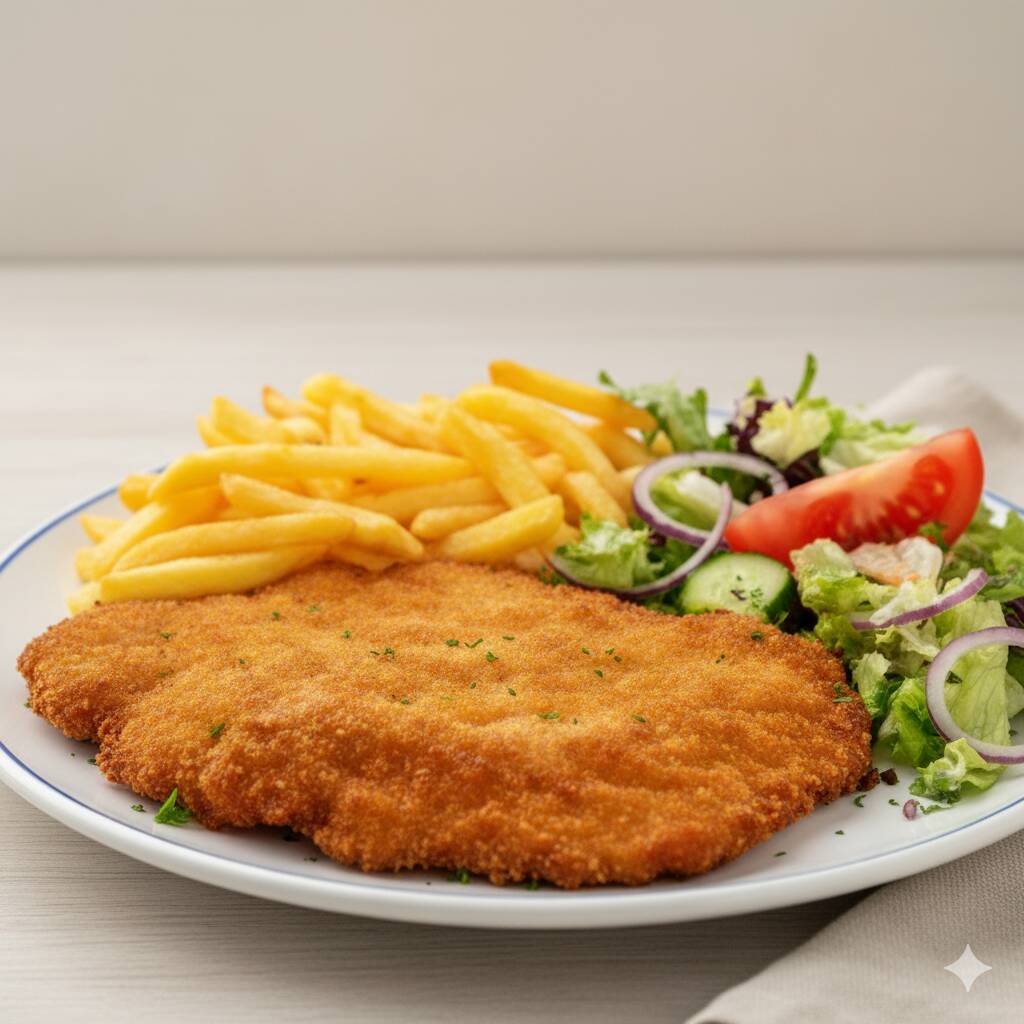 Pollo empanizado acompañado por papas fritas y ensalada verde con un refresco natural del día.