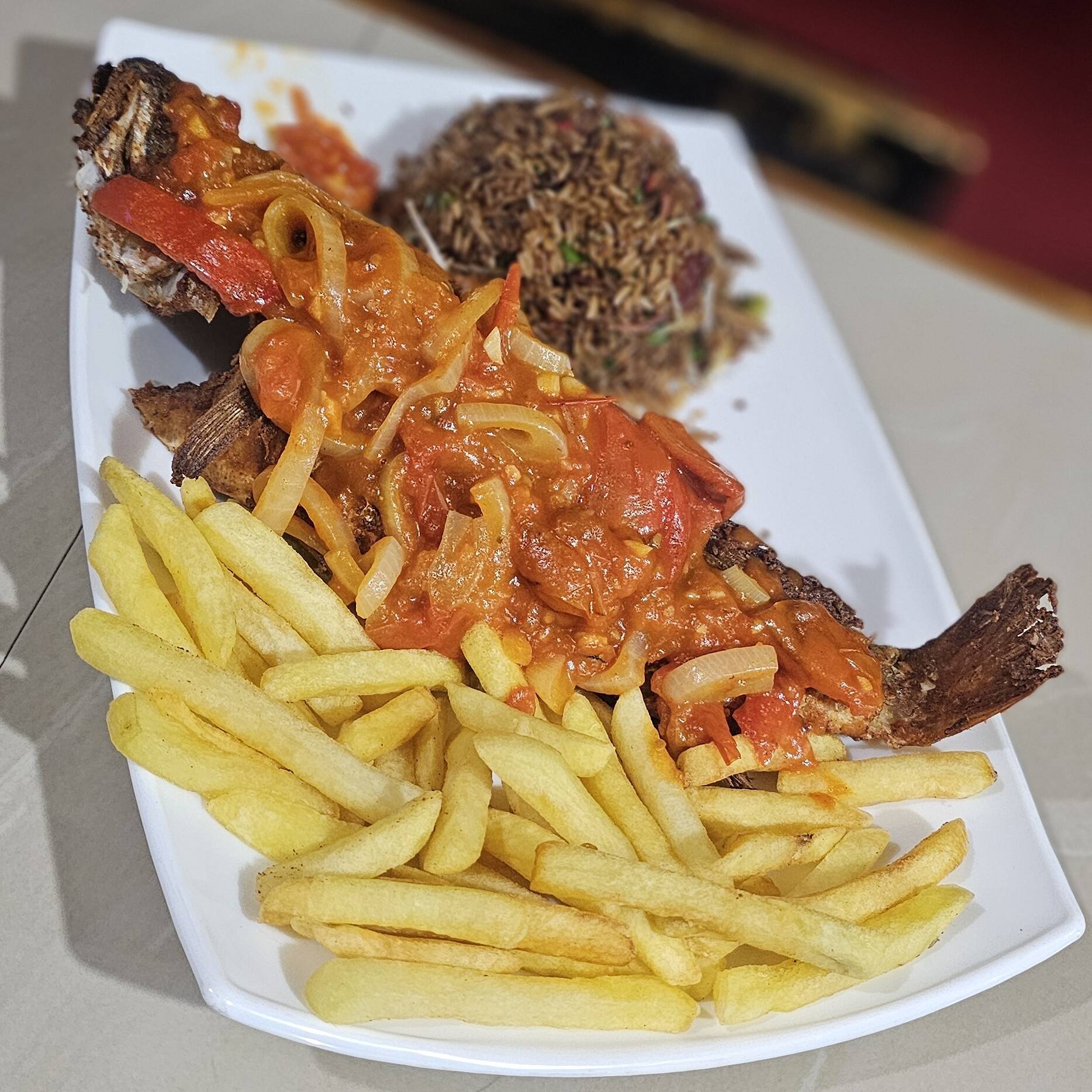 Arroz cantonés, papas fritas, ensalada y proteína a elegir.