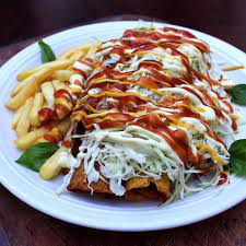 Hecho con tortilla de harina, relleno de frijoles, queso, carne o pollo mechado, arreglado con lechuga, chimichurri, salsa de tomate, mayonesa y mostaza.