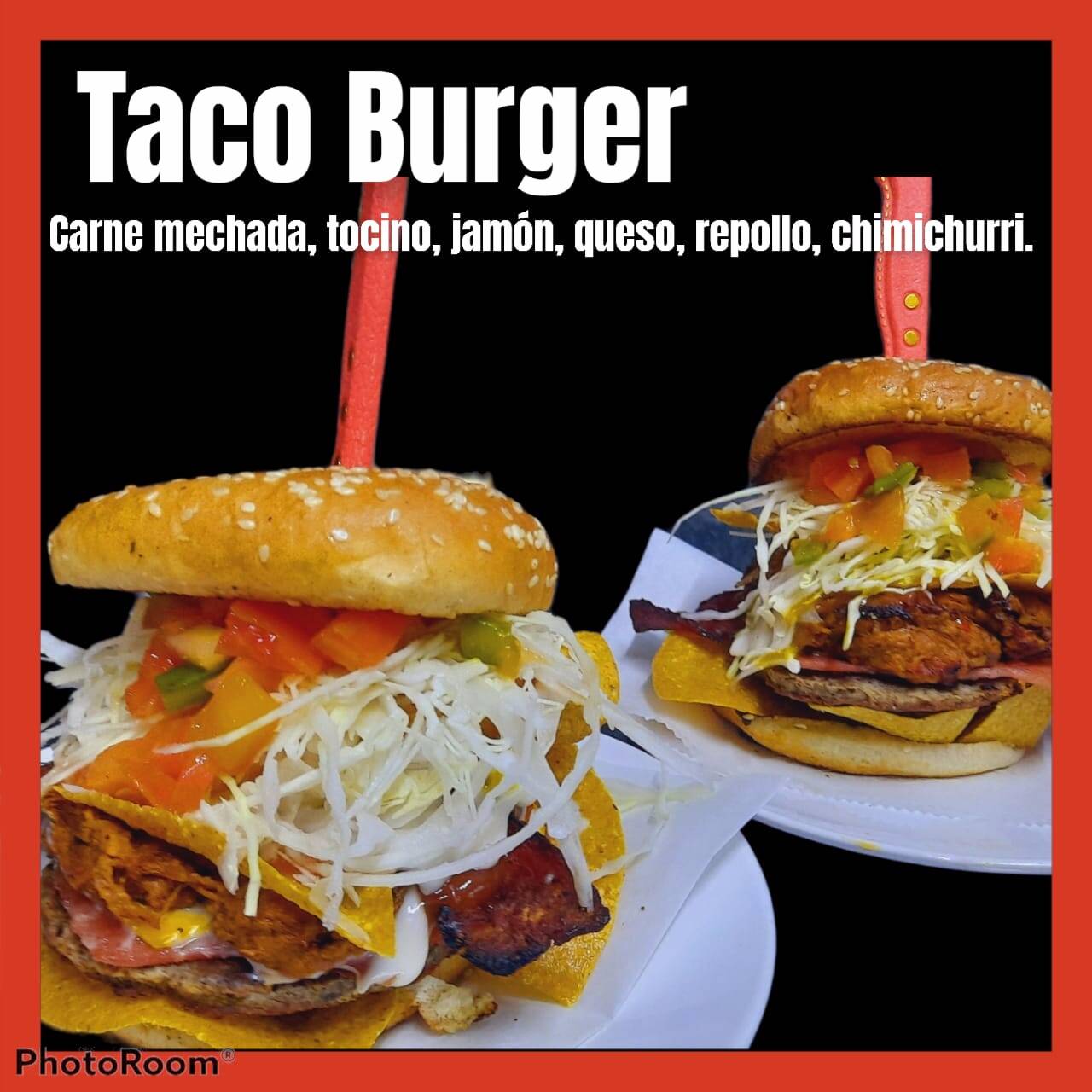 Pan de hamburguesa , Carne mechada , tomate , chimichurri , tortillas de taco , torta de carne , queso tipo americano , jamón , tocino , salsa tomate , mayonesa , mostaza .