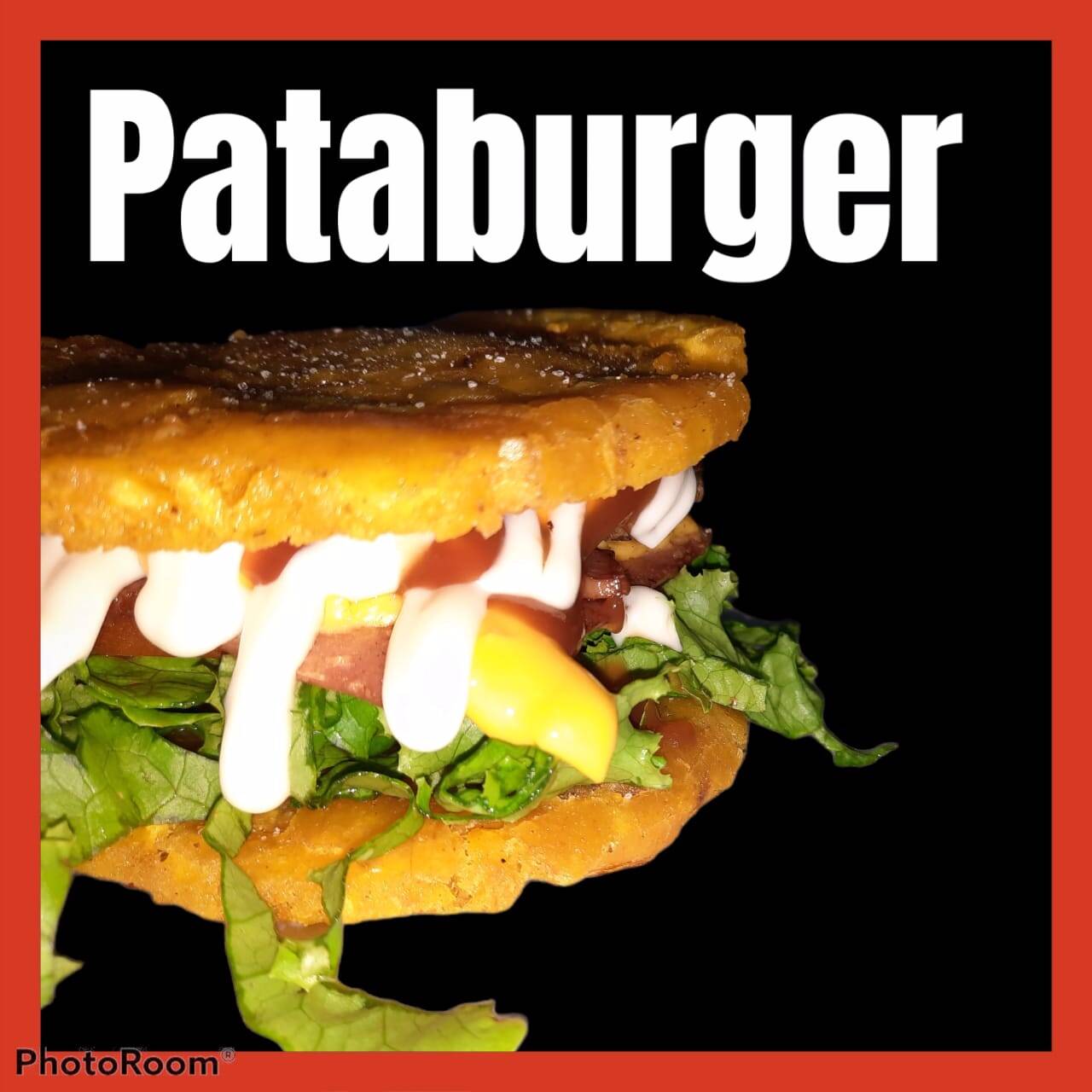 Patacones artesanales, torta de carne, queso tipo americano, jamón, tocineta, cebolla caramelizada, tomate, lechuga, salsa tomate, mayonesa artesanal y mostaza.