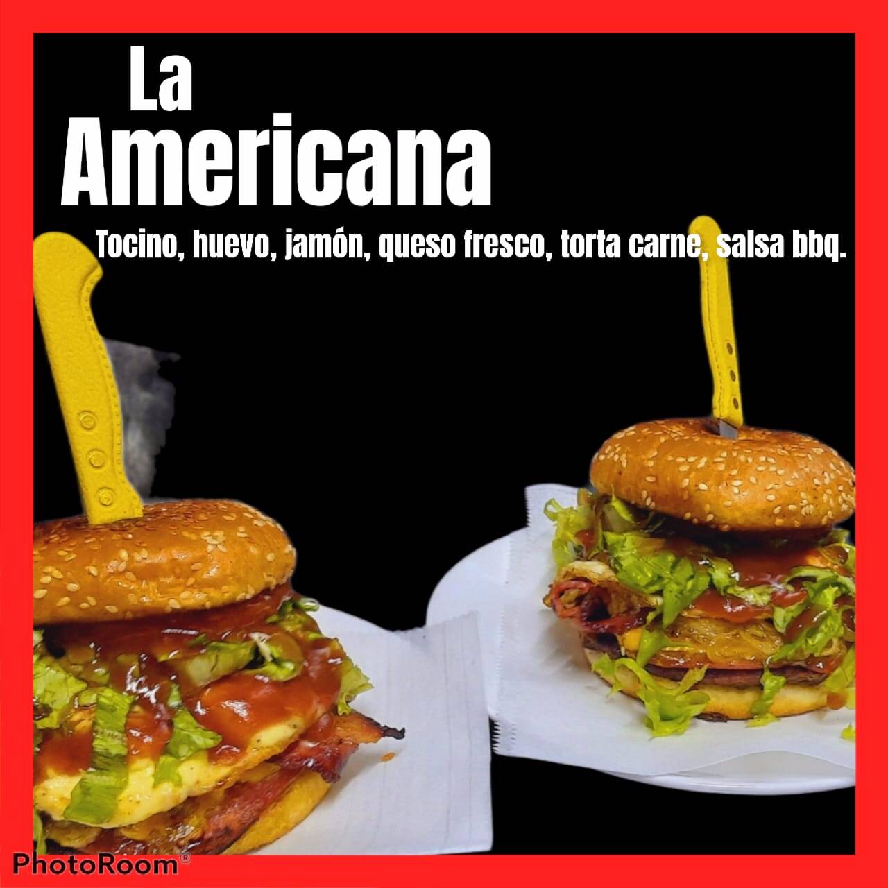 Hamburguesa de pan con ajonjolí 11 centímetros, torta de carne, queso tipo americano, jamón, tocineta, aros de cebolla, salsa barbacoa, lechuga, tomate, salsa tomate, mayonesa artesanal y mostaza.