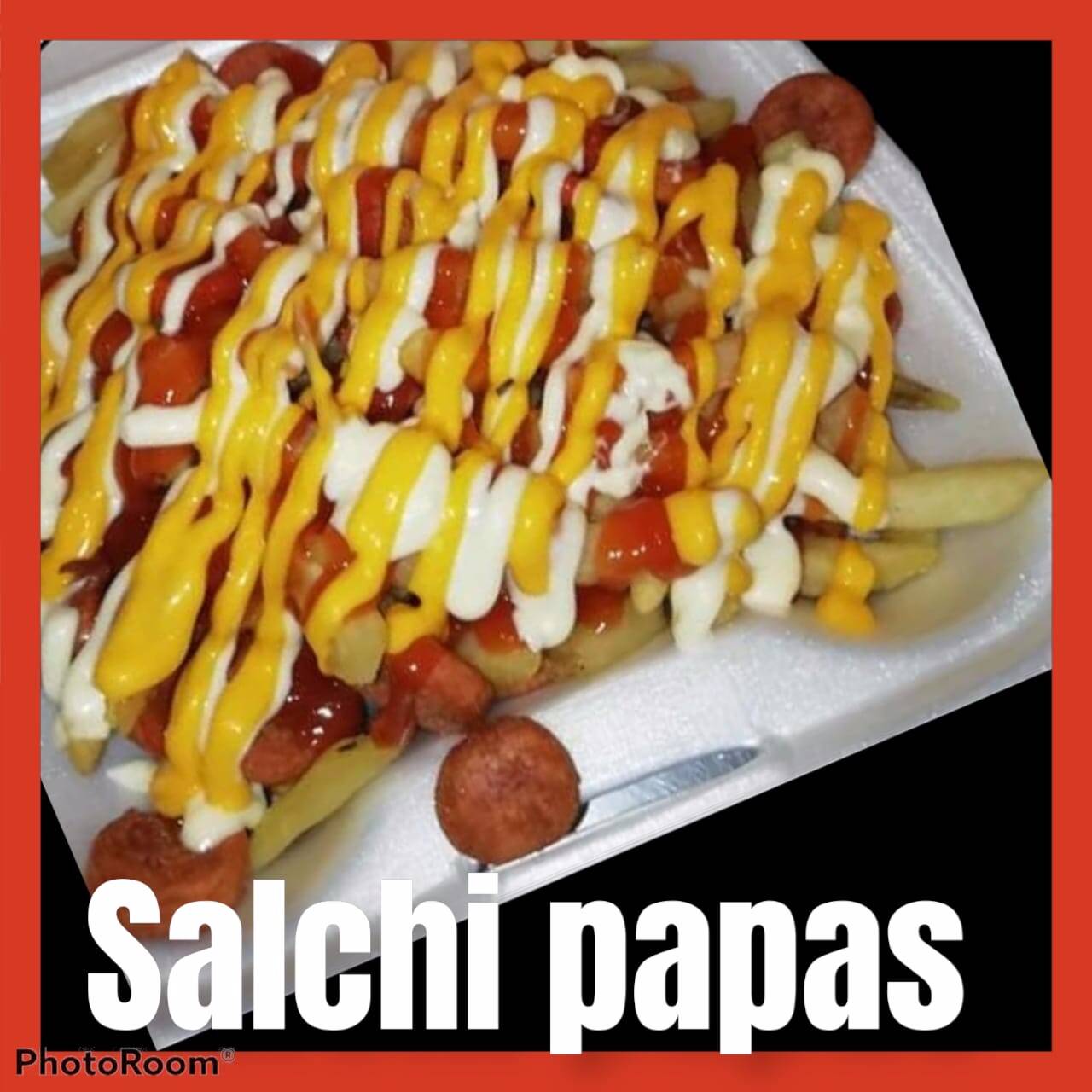 Papas fritas, frijoles refritos, carne mechada o pollo mechado, lechuga, chimichurri de la casa, salsa de tomate, mostaza y salsa de queso.