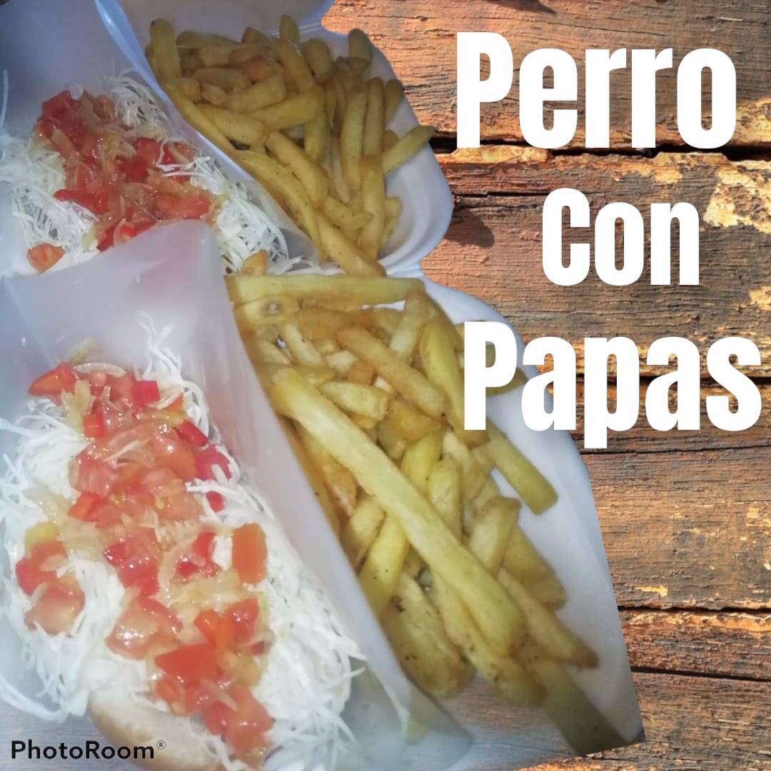 Pan de perro , salchicha frita , repollo , chimichurri , paspas fritas , salsa de tomate , mayonesa , mostaza