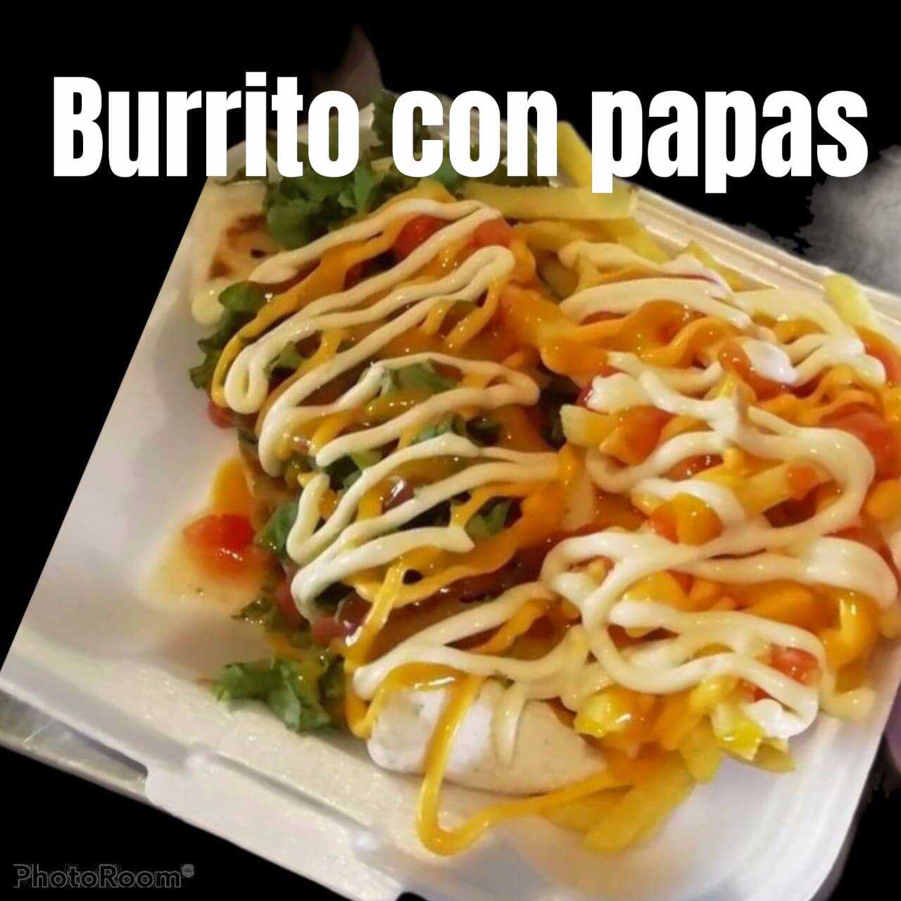 Burrito de carne o pollo, hecho de tortilla de harina suave, relleno de frijoles refritos, queso mozzarella, carne mechada o pollo mechado acompañado de lechuga, chimichurri de la casa, papas fritas, salsa de tomate, mayonesa artesanal y mostaza.