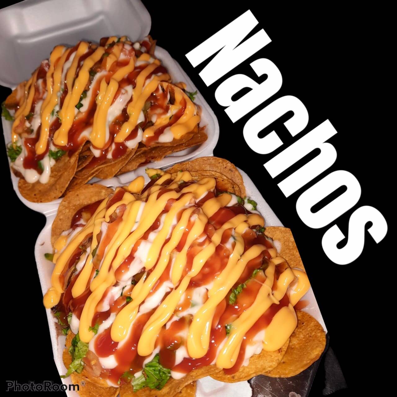 Tortillas de maíz tipo nacho, frijoles refritos, carne mechada o pollo mechado, lechuga, chimichurri de la casa, salsa de tomate, mayonesa y mostaza.