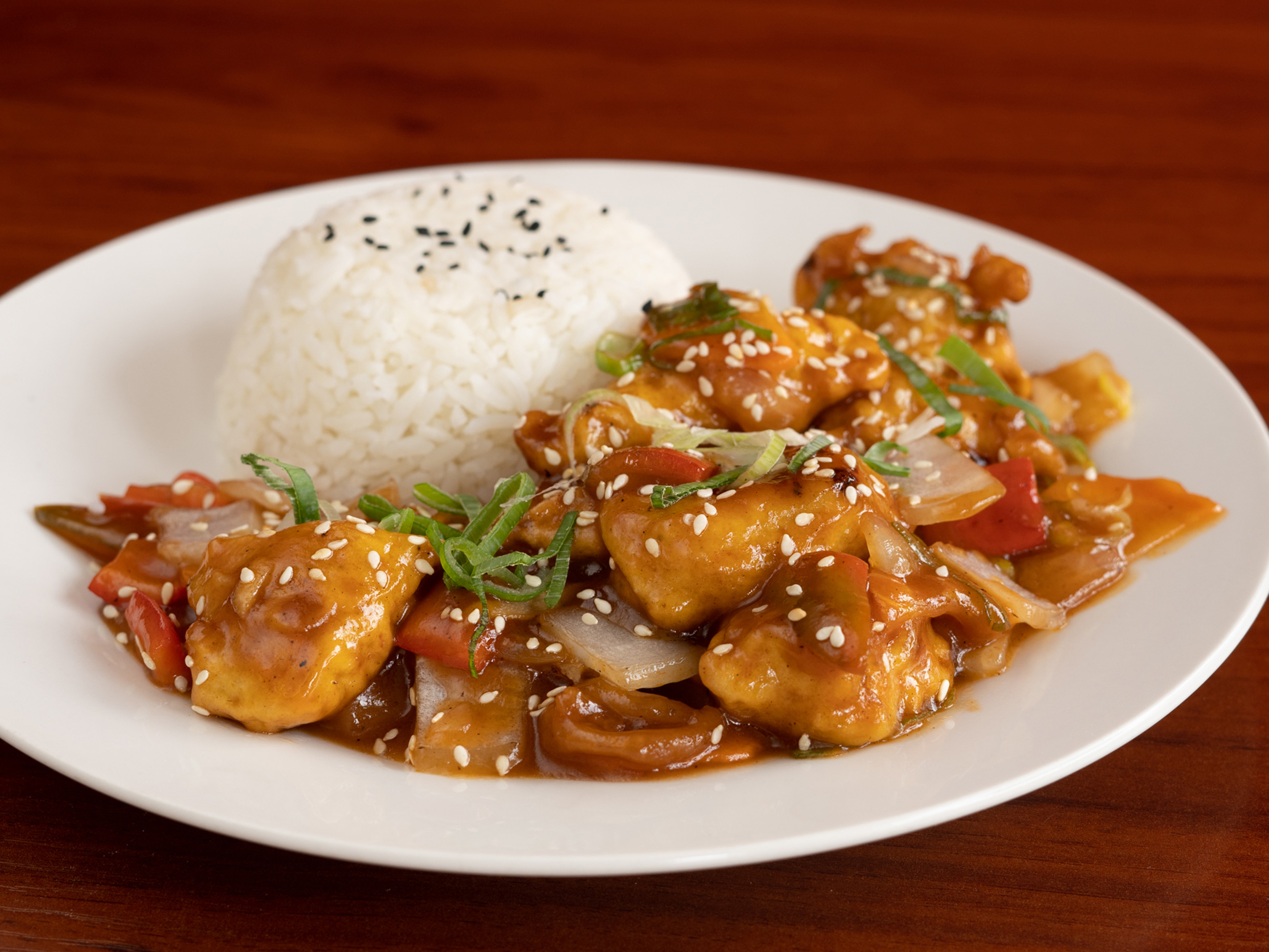Contiene pollo bañado en salsa agridulce acompañado con una cama de arroz blanco.