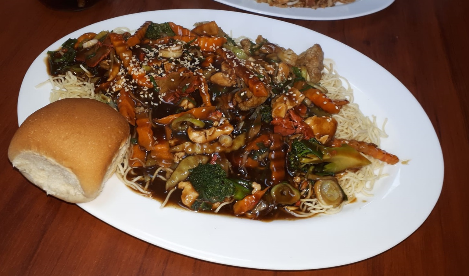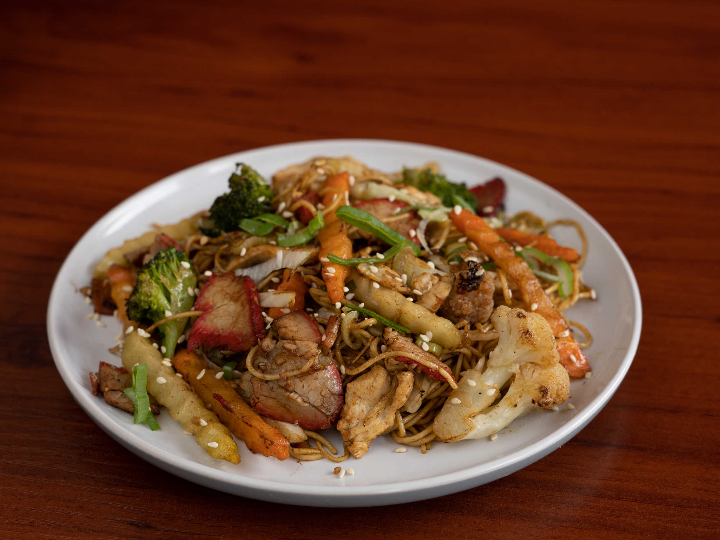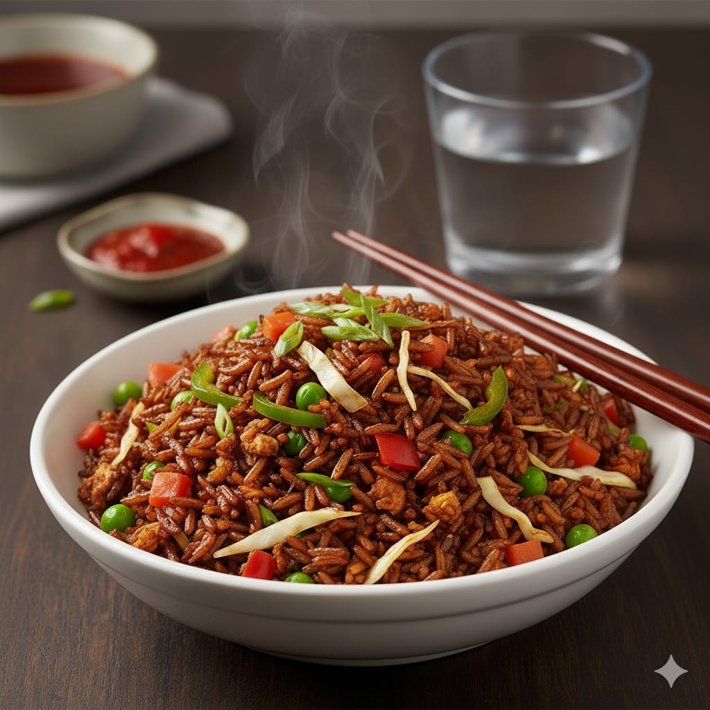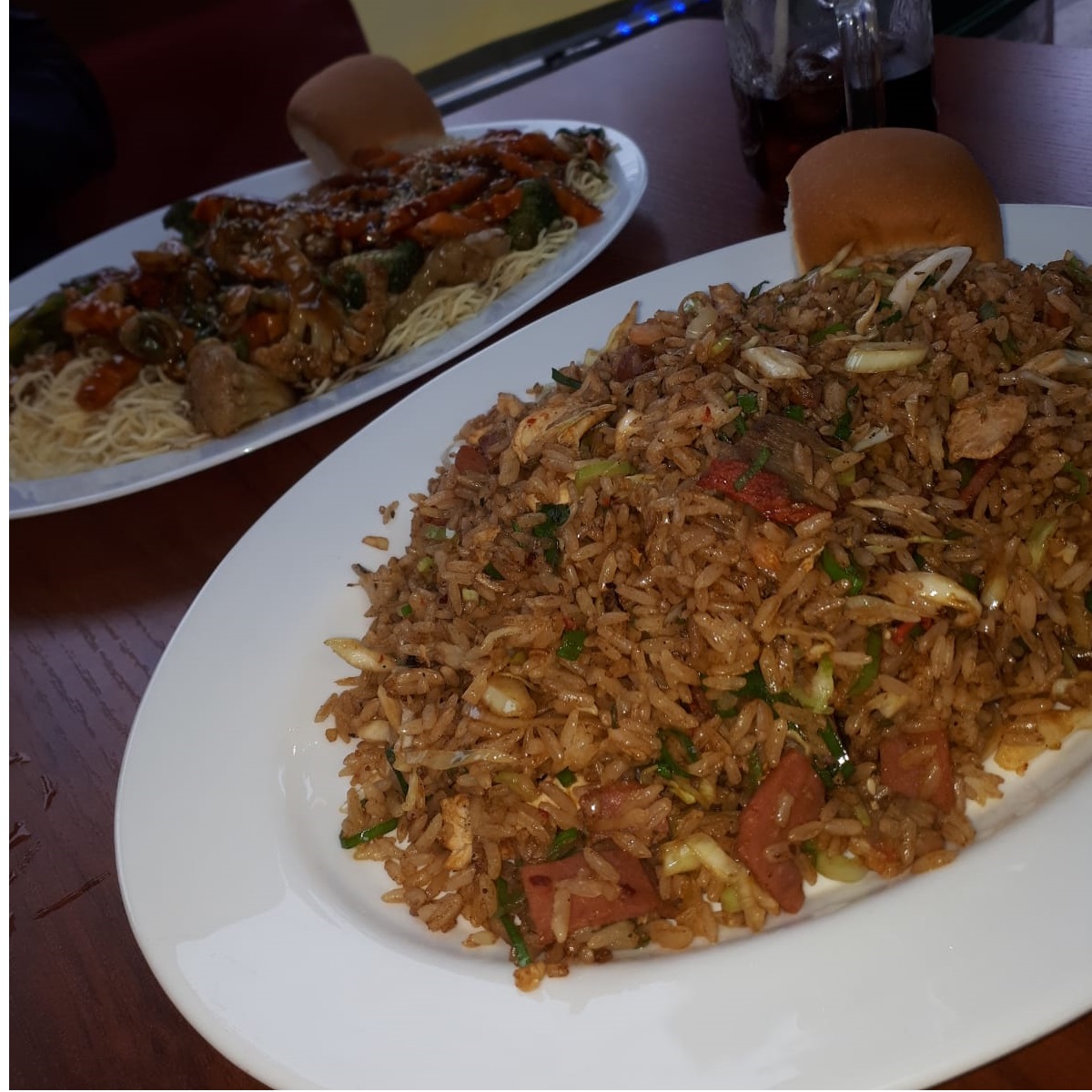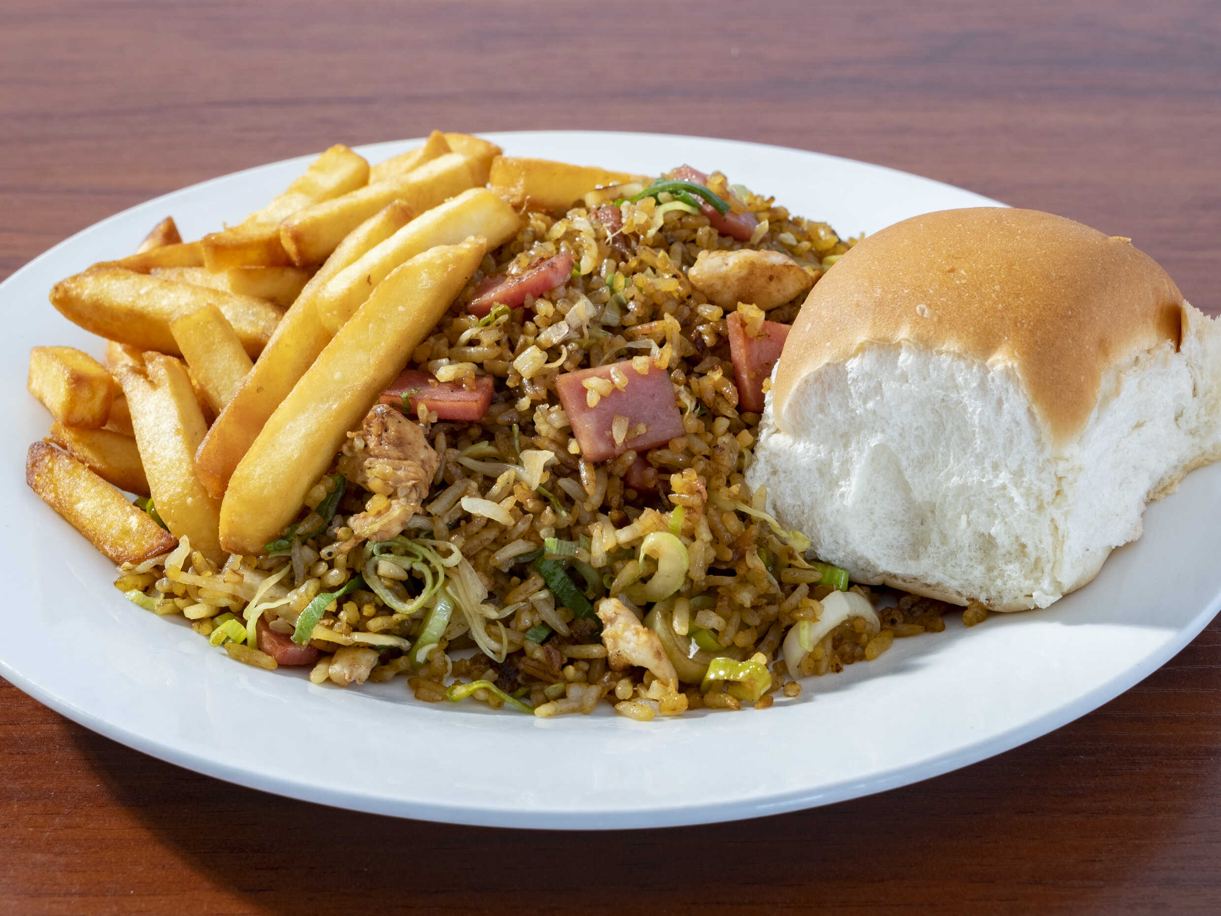 Contiene arroz frito con jamón, pollo, repollo y olores.