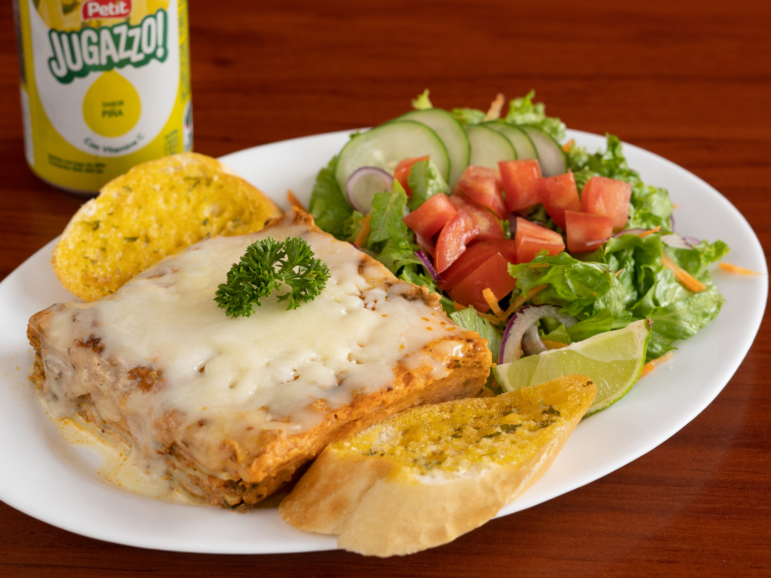 En salsa roja, incluye ensalada verde, pan de ajo gaseosa 250ml.