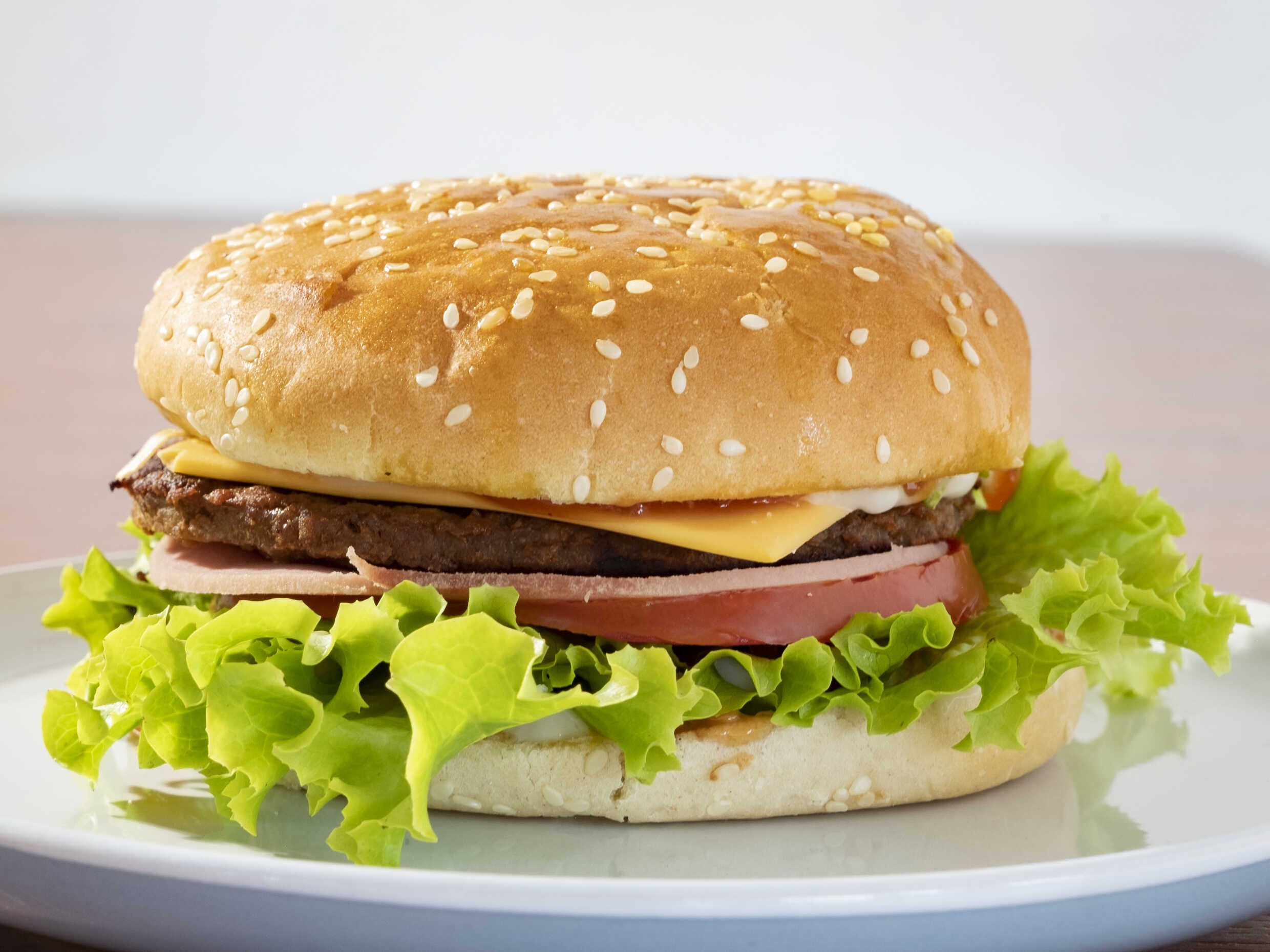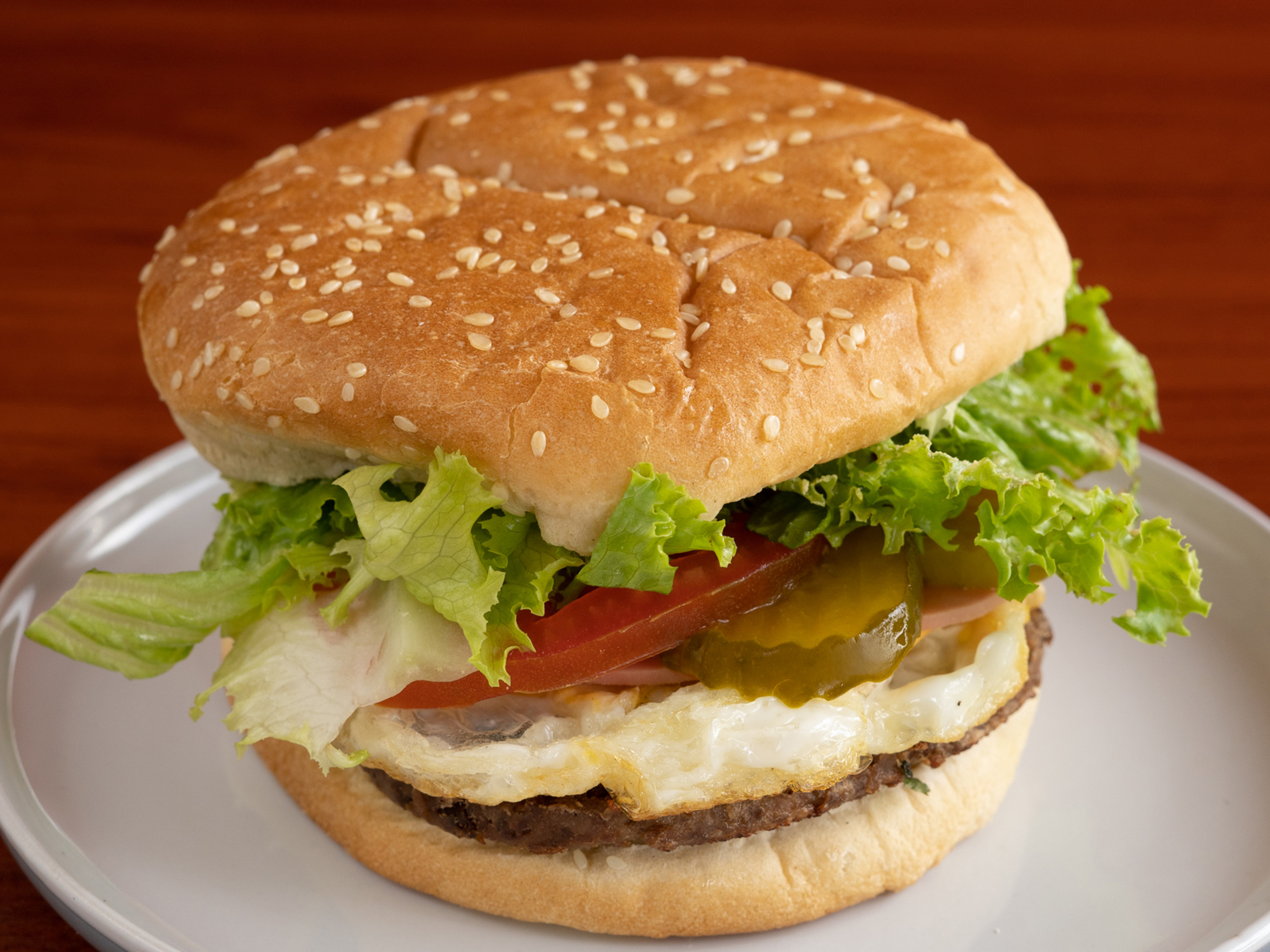Torta de res o de pollo, lechuga, tomate, jamón, queso, torta de huevo y pepinillo.