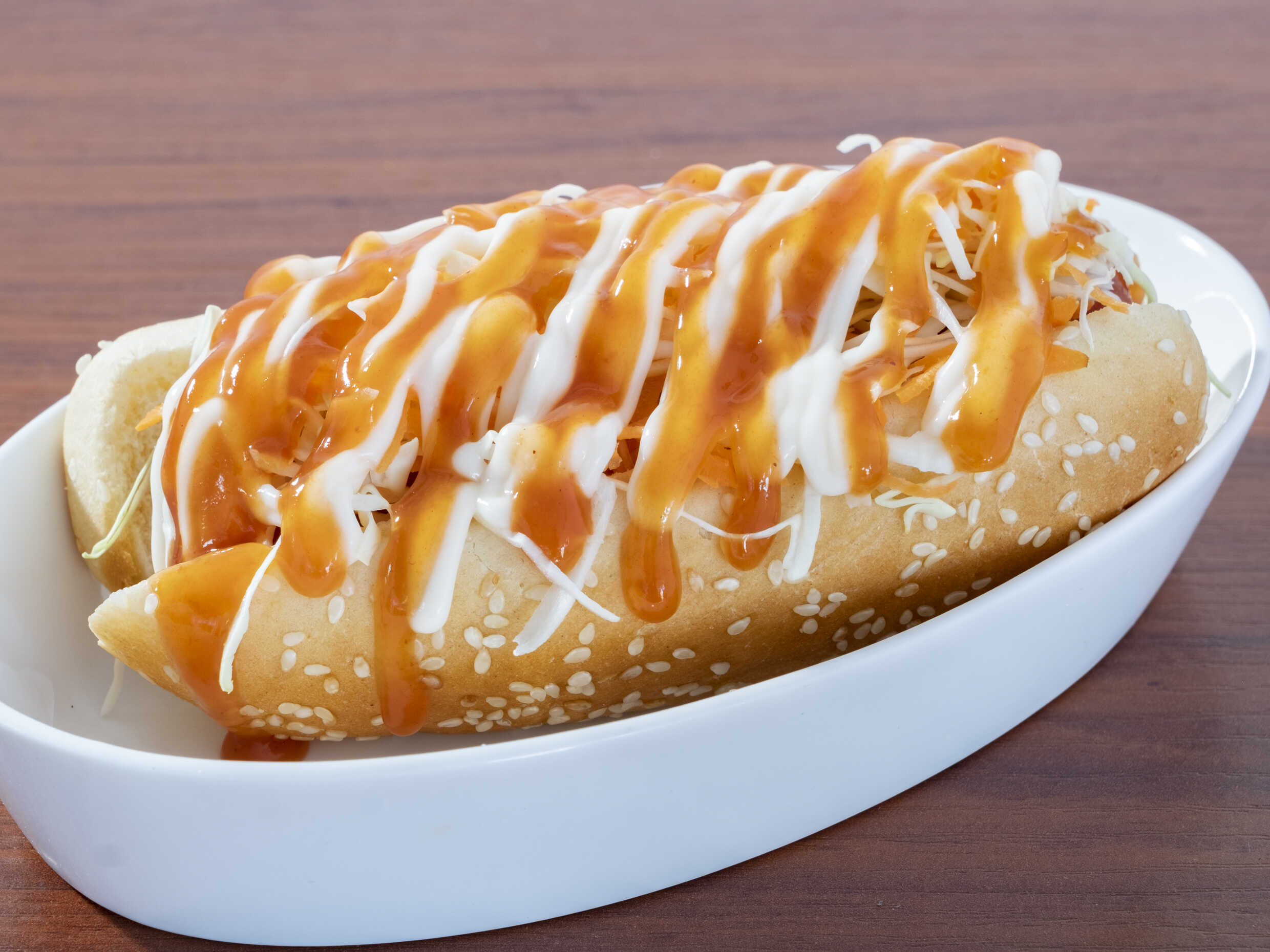 Contiene salchicha, papas tostadas y ensalada rallada.